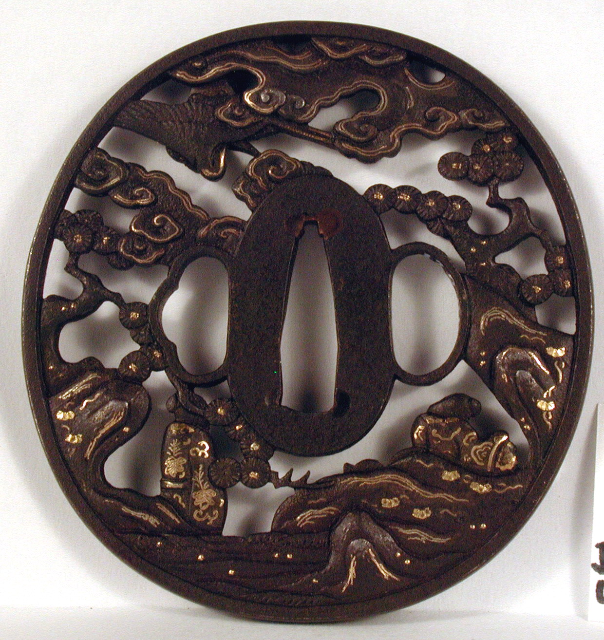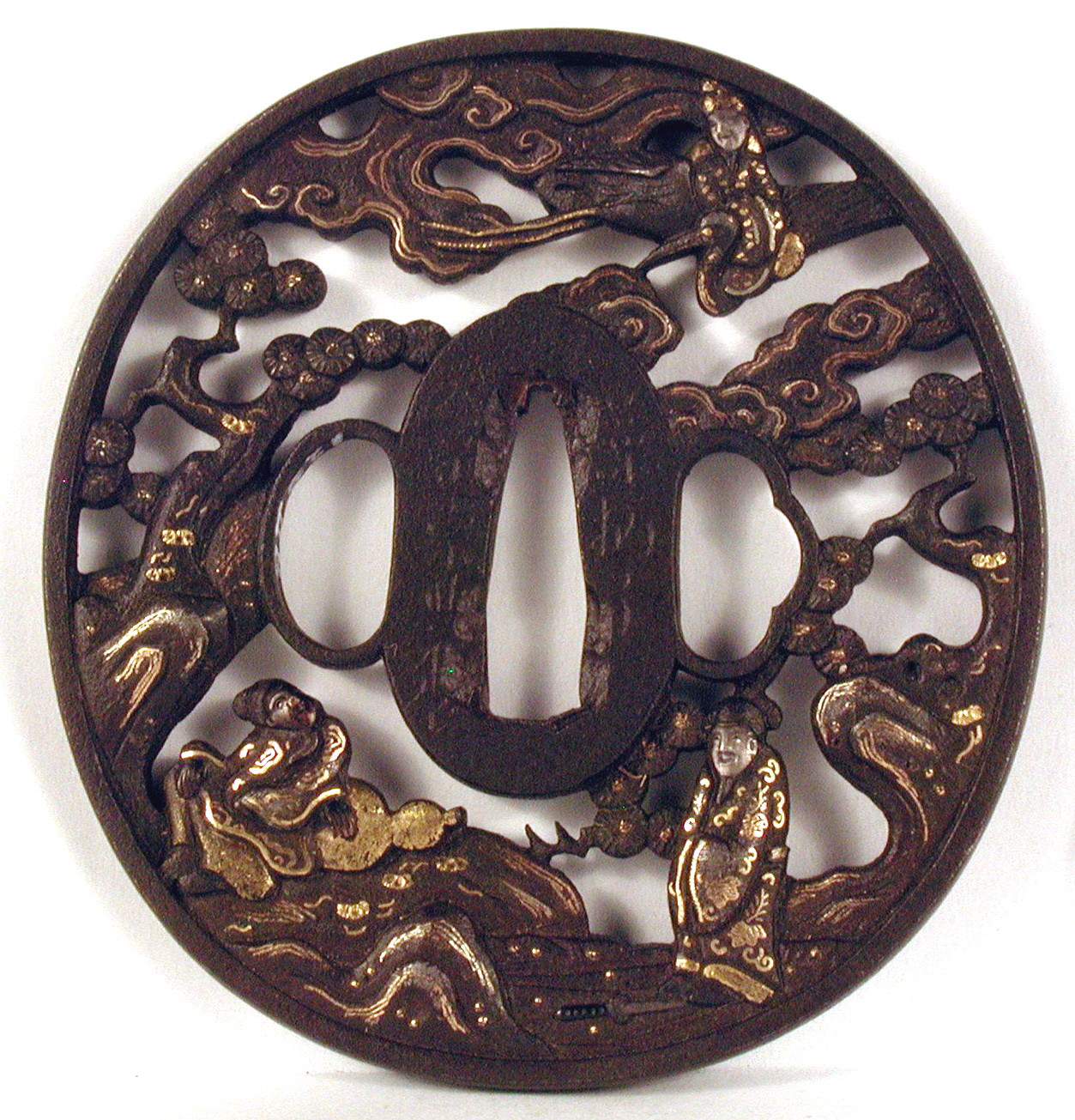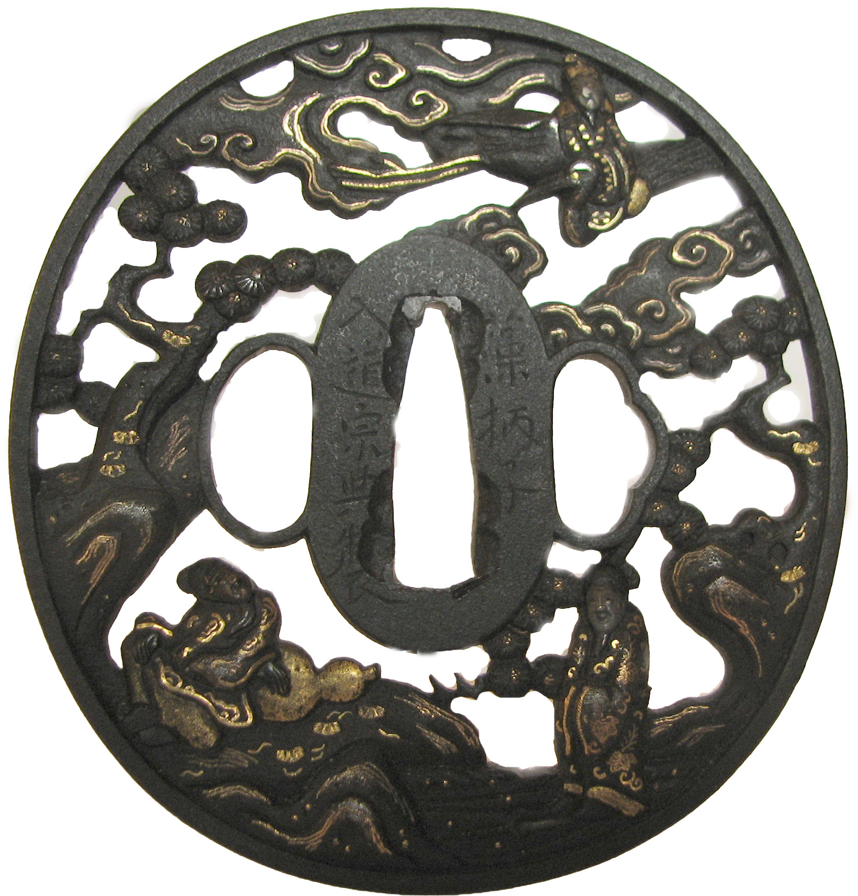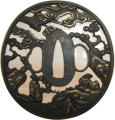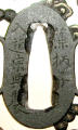 Закладка “Атрибуція” - Наим. предмета, издания: Цуба із зображенням китайських безсмертних (Чжан Голао, Сяо Ші, Люй Дунбін)/Змiн. розміри: 8,1 х 8,5/Змiн.додаток до назва (лист, ...): Цуба залізна овальної форми нага мару гата, з тонким пласким ободом мімі. Має три отвори ріо хіцу. Декорована модельованим з обох боків ажурним зображенням у позитивному силуеті трьох китайських безсмертгних: Чжан Голао з гарбузом-горнлянкою, Сяо Ші,що летить на журавлі, і Люй Дунбін (з мухо гонкою чи мечем?)./Змiн. Написи, клейма, марки: На аверсі на сеппа-даі праворуч від накаго ана підпис: Soheishi ліворуч – Nudo Soten saku (підпис у початковому стані частково втрачений)./Змiн. час створення: Кінець 17 – початок 18 ст.Автор, автор съемки: Сотен Сохеісі Нюдо ІІмісце створення, школа: м. ХіконеНовый материал: залізоНовый материал: дорогоцінні металиИзм. техника: куванняИзм. техника: різьбленняИзм. техника: гравіруванняИзм. техника: інкрустація