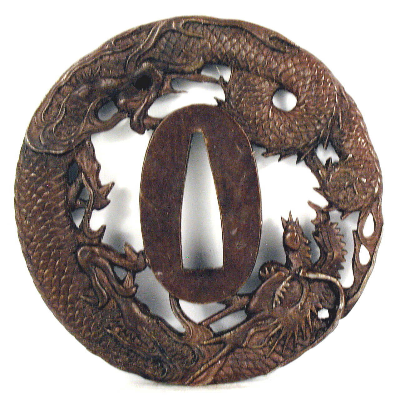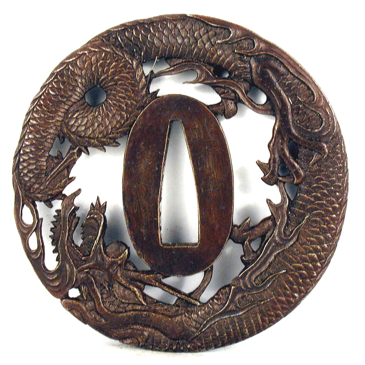 Закладка “Атрибуція” - Наим. предмета, издания: Цуба із зображенням дракона/Змiн. розміри: 7,3 х 7,4 см/Змiн.додаток до назва (лист, ...): Цуба залізна круглої форми мару гата з трьома отворами ріо хіцу (когаі та кодзука хіцу мають неправильну форму, утворену прорізами, підпорядкованими композиції, обід відсутній. Декорована зображенням дракона, який згорнувся колом. Зображення у позитивному силуеті і модельовано з обох боків./Змiн. Написи, клейма, марки: На аверсі на сеппа даї ліворуч від наваго хіцу ана гравіровано: “Кinai saku”; праворуч – “Etidzen ju”. Напис напівстертий./Змiн. час створення: кінець 18 - початок 19 ст.Автор, автор съемки: Кінаі IVмісце створення, школа: провінція ЕтідзенИзм. техника: куванняИзм. техника: різьбленняИзм. техника: гравіруванняИзм. техника: карбування