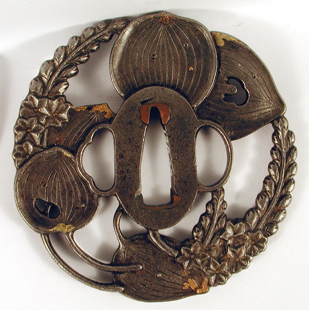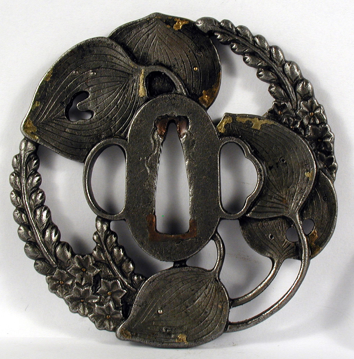 Закладка “Атрибуція” - Наим. предмета, издания: Цуба із зображенням водяної мальви/Змiн. розміри: 8,2 х 8,4 см/Змiн.додаток до назва (лист, ...): Цуба залізна неправильної форми, близької до кола; форма утворюється вигинами листя і квітів. Цуба має три отвори ріо хіцу ана. Модельовано з обох боків зображення листя та квітів водяної мальви (sagi-ni-mi zuaoi), (depiction of Pickerel Weed)./Змiн. час створення: 17 ст.Автор, автор съемки: Майстер школи Сьоамімісце створення, школа: ЯпоніяИзм. техника: куванняИзм. техника: різьбленняИзм. техника: гравіруванняИзм. техника: інкрустація