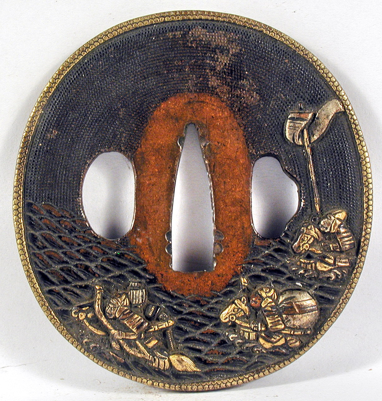 Закладка “Атрибуція” - Наим. предмета, издания: Цуба із зображенням вершників серед хвиль (сцена зі "Сказання про Хейке")/Змiн. розміри: 6,6 х 7,0 см/Змiн. час створення: XIX ст.Изм. техника: куванняИзм. техника: гравіруванняИзм. техника: позолота