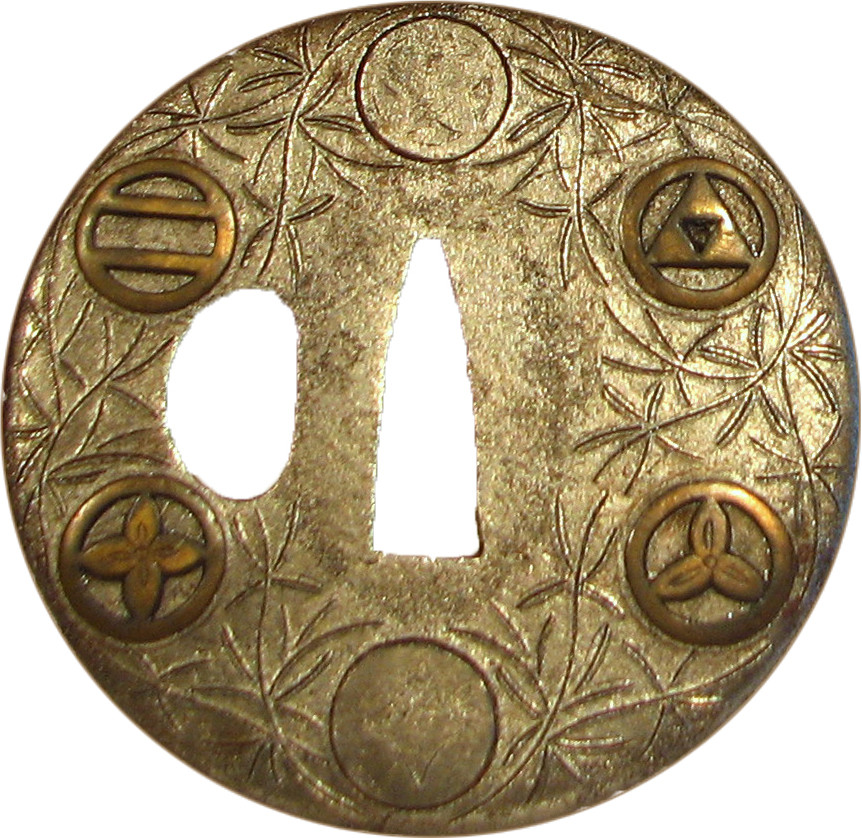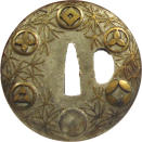 Закладка “Атрибуція” - Наим. предмета, издания: Цуба із зображенням емблем "мон"/Змiн. час створення: XVII ст.місце створення, школа: стиль ЙосіроНовый материал: залізоНовый материал: бронзаИзм. техника: куванняИзм. техника: інкрустація бронзоюИзм. техника: накладний рельєф