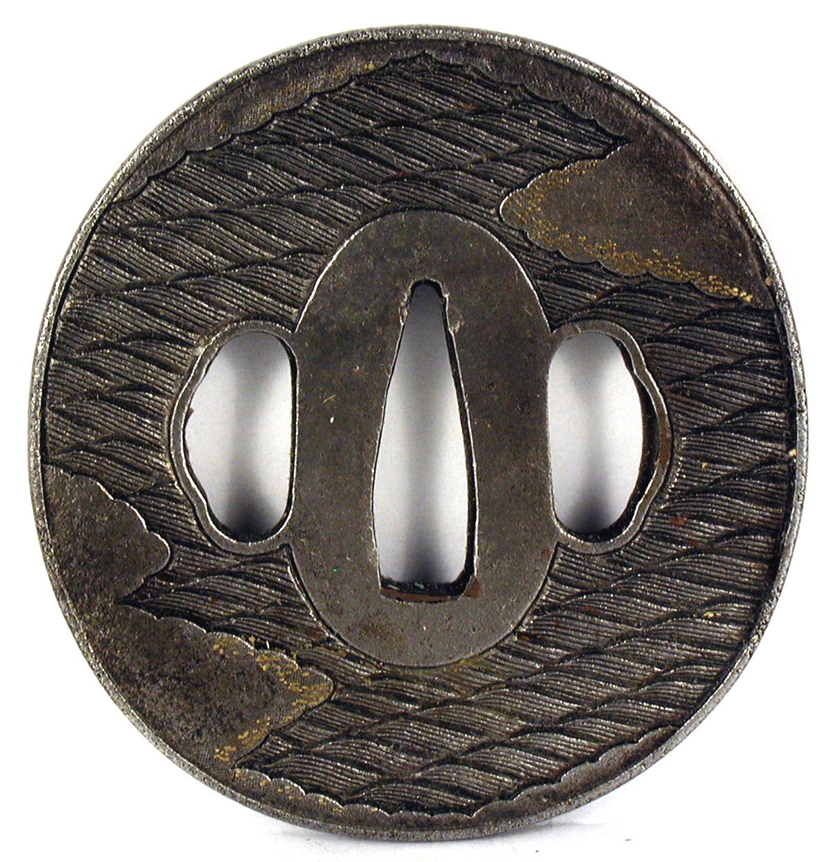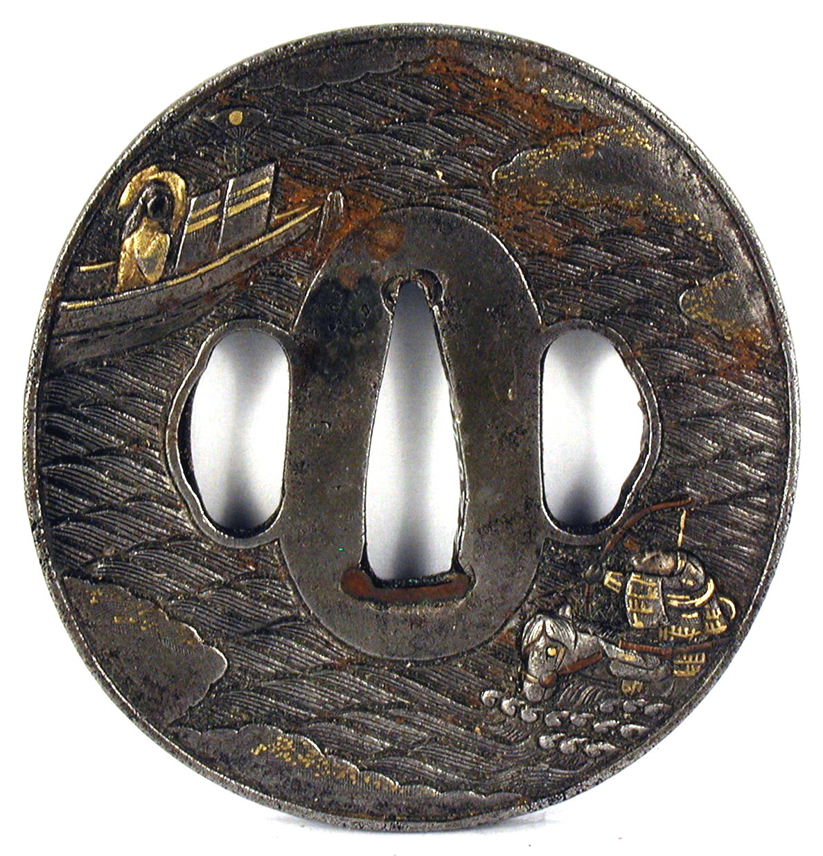 Закладка “Атрибуція” - Наим. предмета, издания: Цуба із зображенням вершника серед хвиль (сцена зі "Сказання про Хейке")/Змiн. розміри: 6,9 х 7,2 см/Змiн. час створення: XVIII ст.Автор, автор съемки: Невідомий майстерИзм. техника: куванняИзм. техника: гравіруванняИзм. техника: накладний рельєфИзм. техника: інкрустаціяИзм. техника: позолота