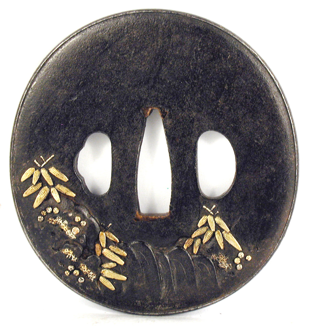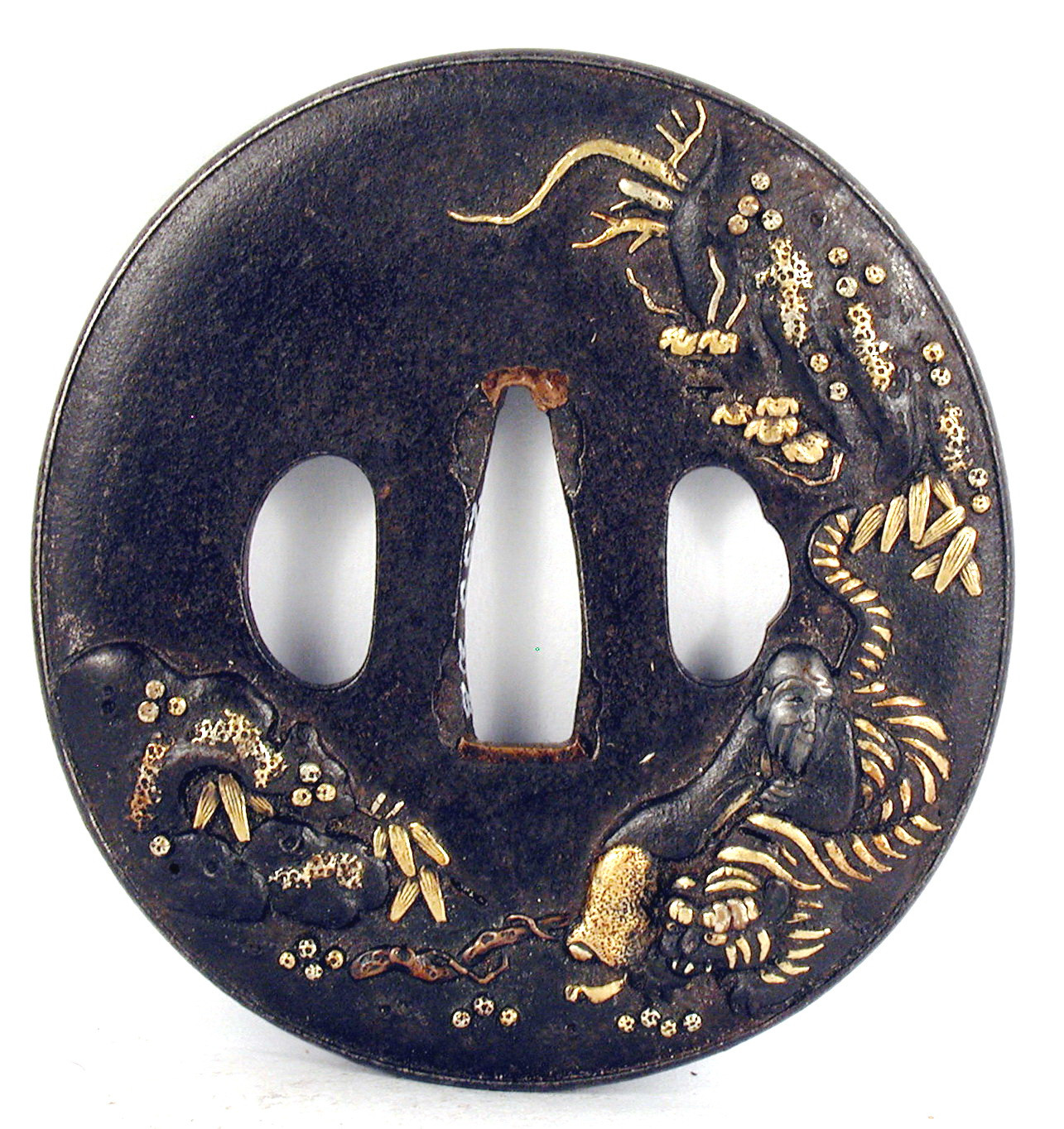 Закладка “Атрибуція” - Наим. предмета, издания: Цуба із зображенням Шокі із тигром/Змiн. розміри: 7,4 х 8,0 см/Змiн. час створення: XVIII ст.Автор, автор съемки: Невідомий майстерИзм. техника: куванняИзм. техника: гравіруванняИзм. техника: інкрустація бронзоюИзм. техника: позолота