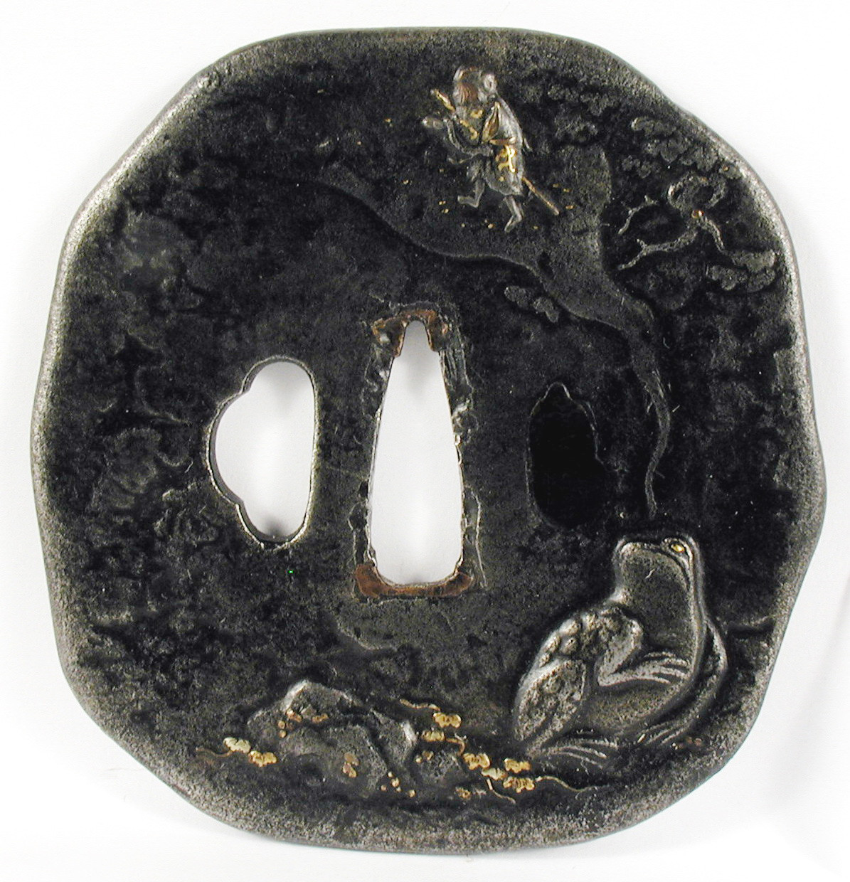Закладка “Атрибуція” - Наим. предмета, издания: Цуба із зображенням сенніна Гама/Змiн. розміри: 8,9 х 8,2 см/Змiн.додаток до назва (лист, ...): Цуба залізна круглої форми аоігата з рельєфним краєм мімі, має три отвори ріо хіцу ( отвір когаі хіцу закрито металевою пластинкою). На аверсі зображено жабу, від якої еманує енергія, що підносить святого .На реверсі – сухий кущ на березі річки./Змiн. час створення: Кінець 17 – початок 18 ст.Автор, автор съемки: Майстер школи Канеіемісце створення, школа: ЯпоніяИзм. техника: куванняИзм. техника: гравіруванняИзм. техника: інкрустація