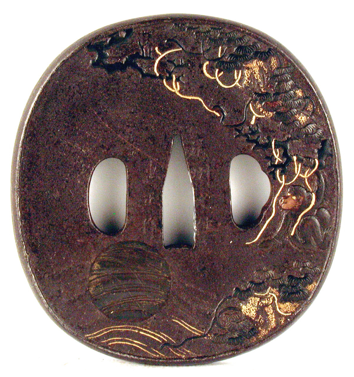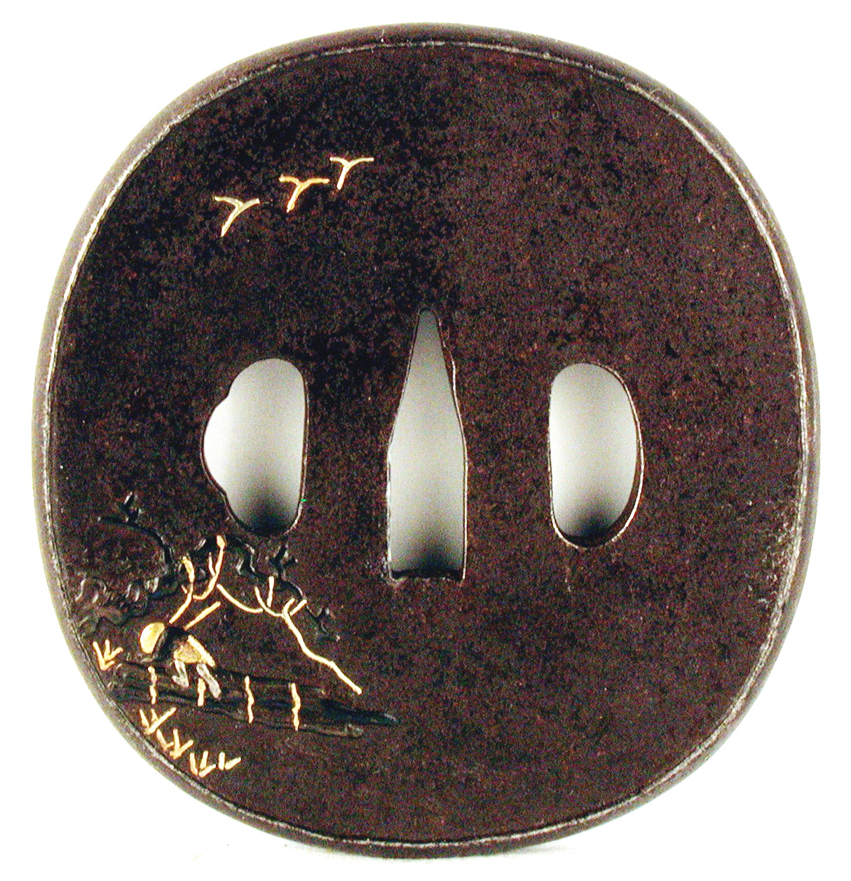 Історія Атрибуціi: 1. Консультація 1961 р. наукового співробітника Державного Ермітажу, канд. іст. наук В.Т. Дашкевич: цуба із заліза з рельєфно інкрустованим бронзою сякудо, сібуїті та золотом зображенням мавпи у гілках та місяця, що відбивається у хвилях. Підпис: Тадамаса зробив - мешканець провінції Осю. 18 ст./Кількість: 1/Опис: Уздовж центрального отвору гравіровано підпис: Тадамаса зробив, мешканець провінції Осю.