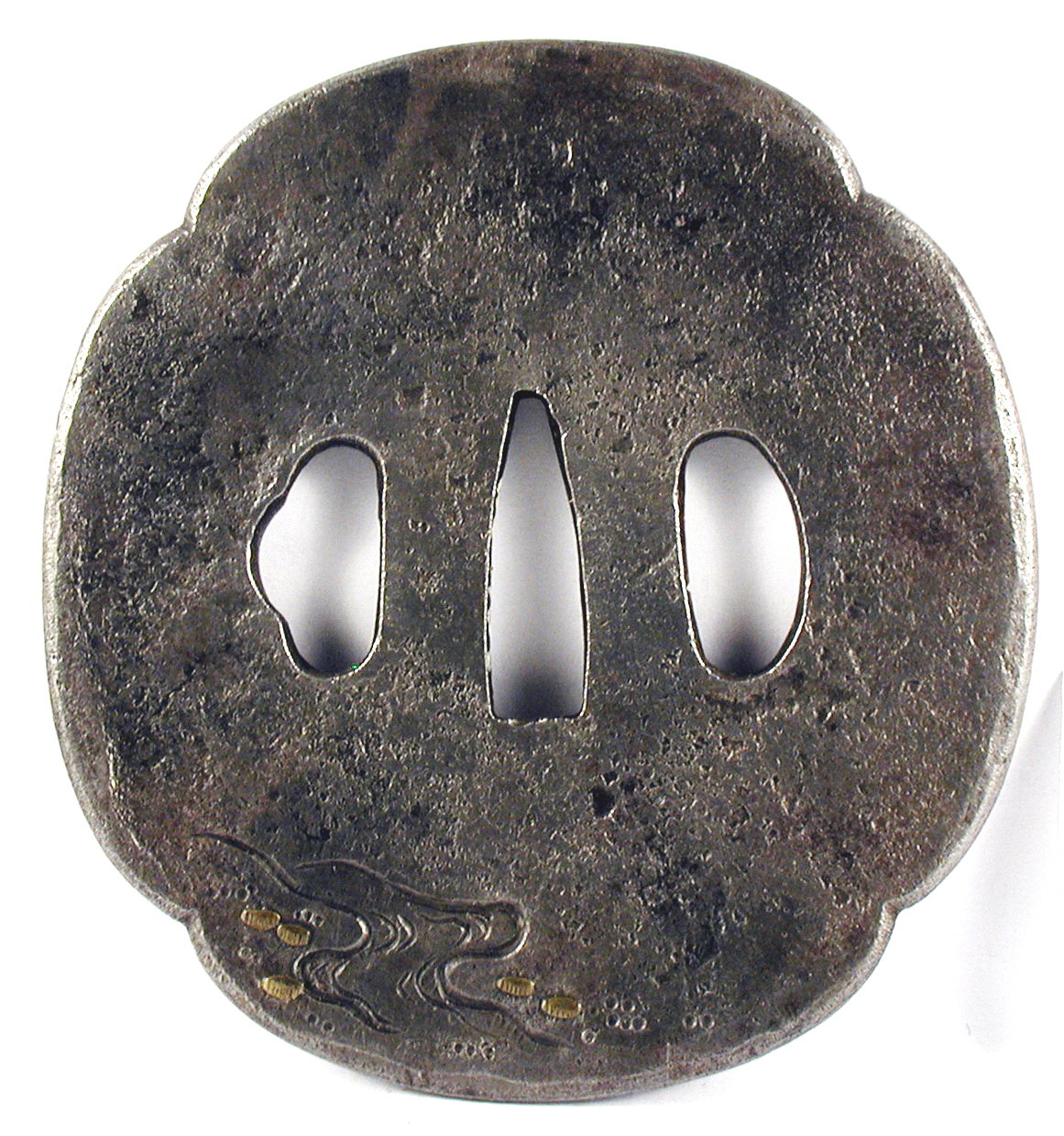 Закладка “Атрибуція” - Наим. предмета, издания: Цуба із зображенням бабки/Змiн. розміри: 7,9 х 8,4/Змiн.додаток до назва (лист, ...): Цуба залізна круглої мокко-форми; має 3 отвори: наваго-, кодзука- та когаї-ана; має тонкий рельєфний край. На аверсі угорі в техніці накладного рельєфу зображено бабку; внизу – рельєфні личинки бабки (?). На реверсі: рельєфно зображено берег струмка і в накладному рельєфі – невеликі квітки (?)./Змiн. час створення: 17 ст.Автор, автор съемки: Майстер школи Сьоамімісце створення, школа: школа СьоаміНовый материал: залізоНовый материал: мідний сплавИзм. техника: куванняИзм. техника: гравіруванняИзм. техника: накладний рельєф