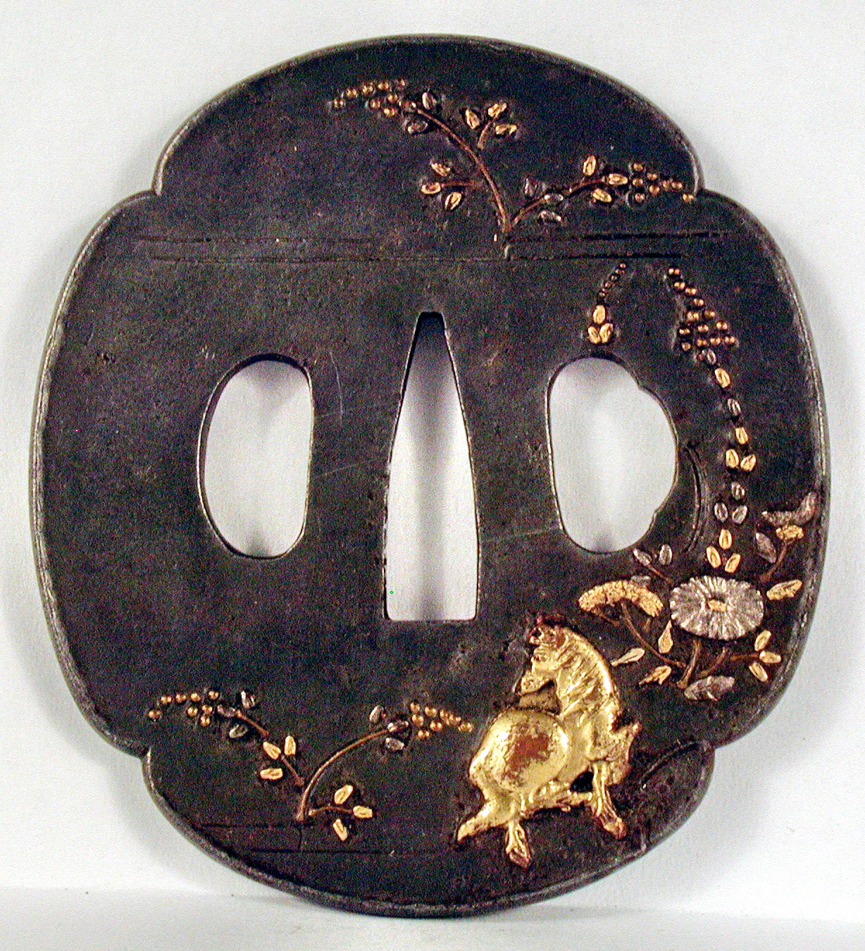 Історія Атрибуціi: 1. Консультація 1961 р. наукового співробітника Державного Ермітажу, канд. іст. наук В.Т. Дашкевич: Коні. Залізо, золото, сякудо. Канеко Юкінао (Юкінакі ? - зав.відділом Крижицький О.В.) в провінціії Нагато. 17 ст./Кількість: 1