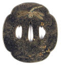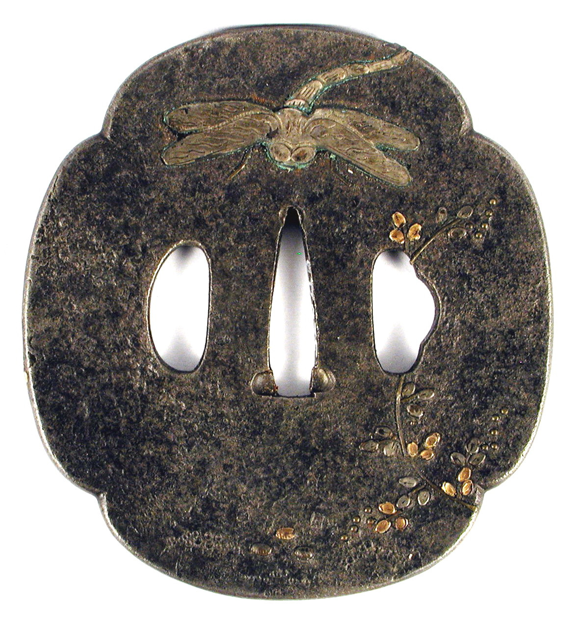Закладка “Атрибуція” - Наим. предмета, издания: Цуба із зображенням бабки/Змiн. розміри: 7,9 х 8,6/Змiн.додаток до назва (лист, ...): Цуба залізна мокко-форми; має 3 отвори: наваго-, кодзука- та когаї-ана; край мімі тонкий рельєфний. На аверсі угорі в техніці накладного рельєфу зображено бабку; внизу – рельєфні частково золочені стеблини трави, на реверсі – рельєфне зображення трави.Автор, автор съемки: Майстер школи Сьоамімісце створення, школа: школа СьоаміИзм. техника: куванняИзм. техника: гравіруванняИзм. техника: інкрустаціяИзм. техника: позолотаНовый материал: залізоНовый материал: мідний сплавНовый материал: дорогоцінні металиИзм. техника: накладний рельєф