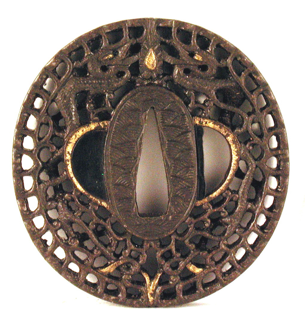 Закладка “Атрибуція” - Наим. предмета, издания: Цуба у стилі "намбан" із зображенням двох стилізованих істот/Змiн. розміри: 7,1 х 7,4 см/Змiн. час створення: 17 - 18 ст.Автор, автор съемки: Невідомий майстермісце створення, школа: стиль НамбанИзм. техника: куванняИзм. техника: різьбленняИзм. техника: гравіруванняИзм. техника: патинуванняИзм. техника: позолота