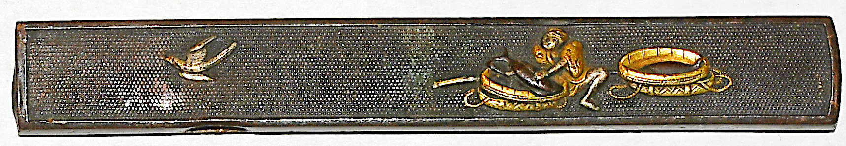 Закладка “Атрибуція” - Наим. предмета, издания: Кодзука із рибалкою та пташкою/Змiн. розміри: 9,7 х 1,3 см/Змiн. час створення: XIX ст.Новый материал: бронза