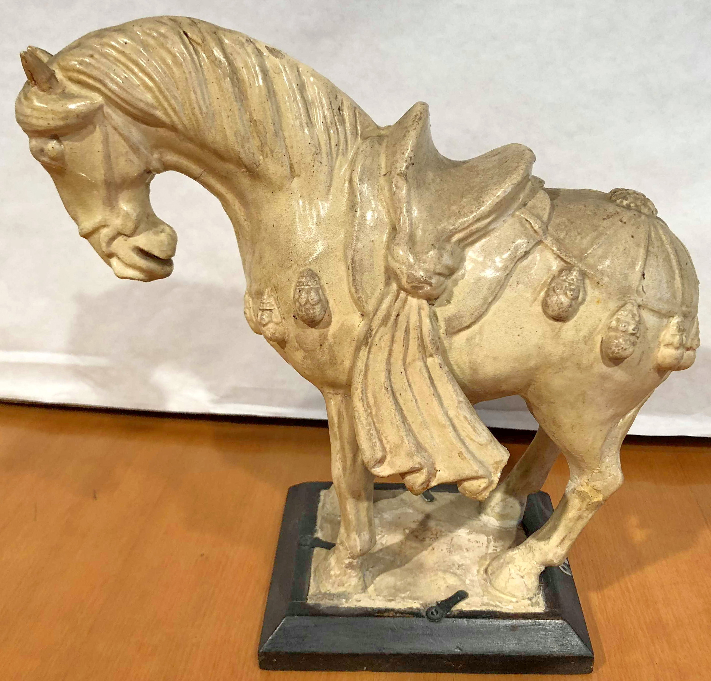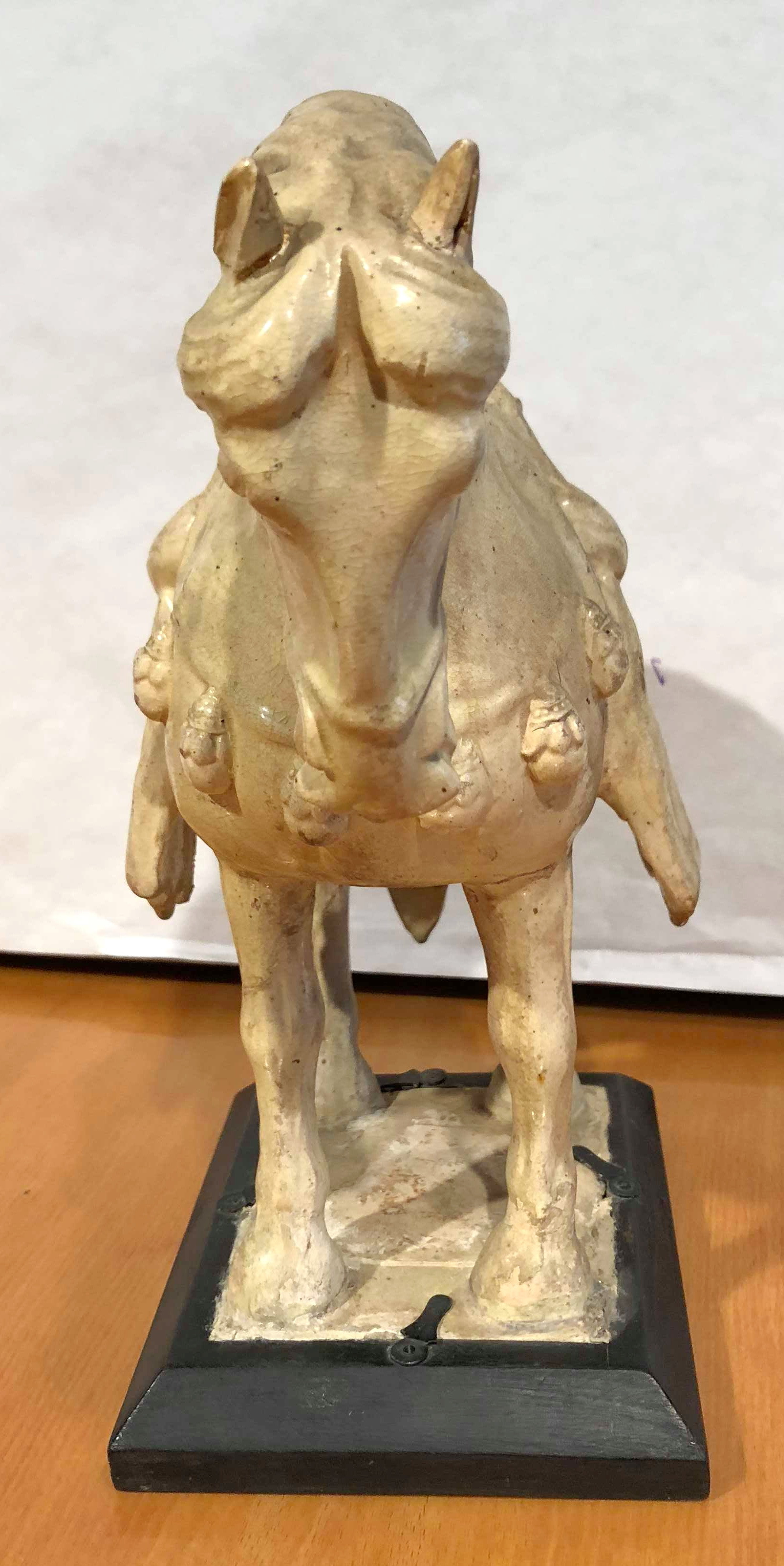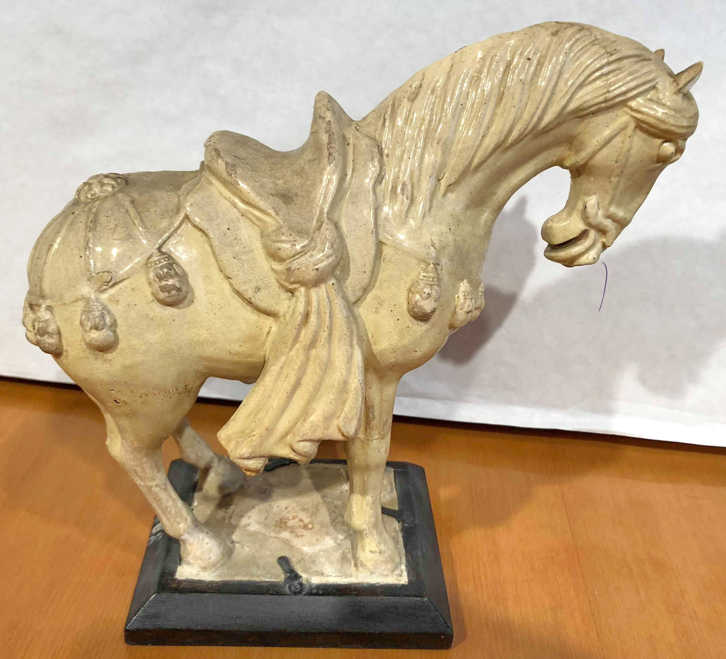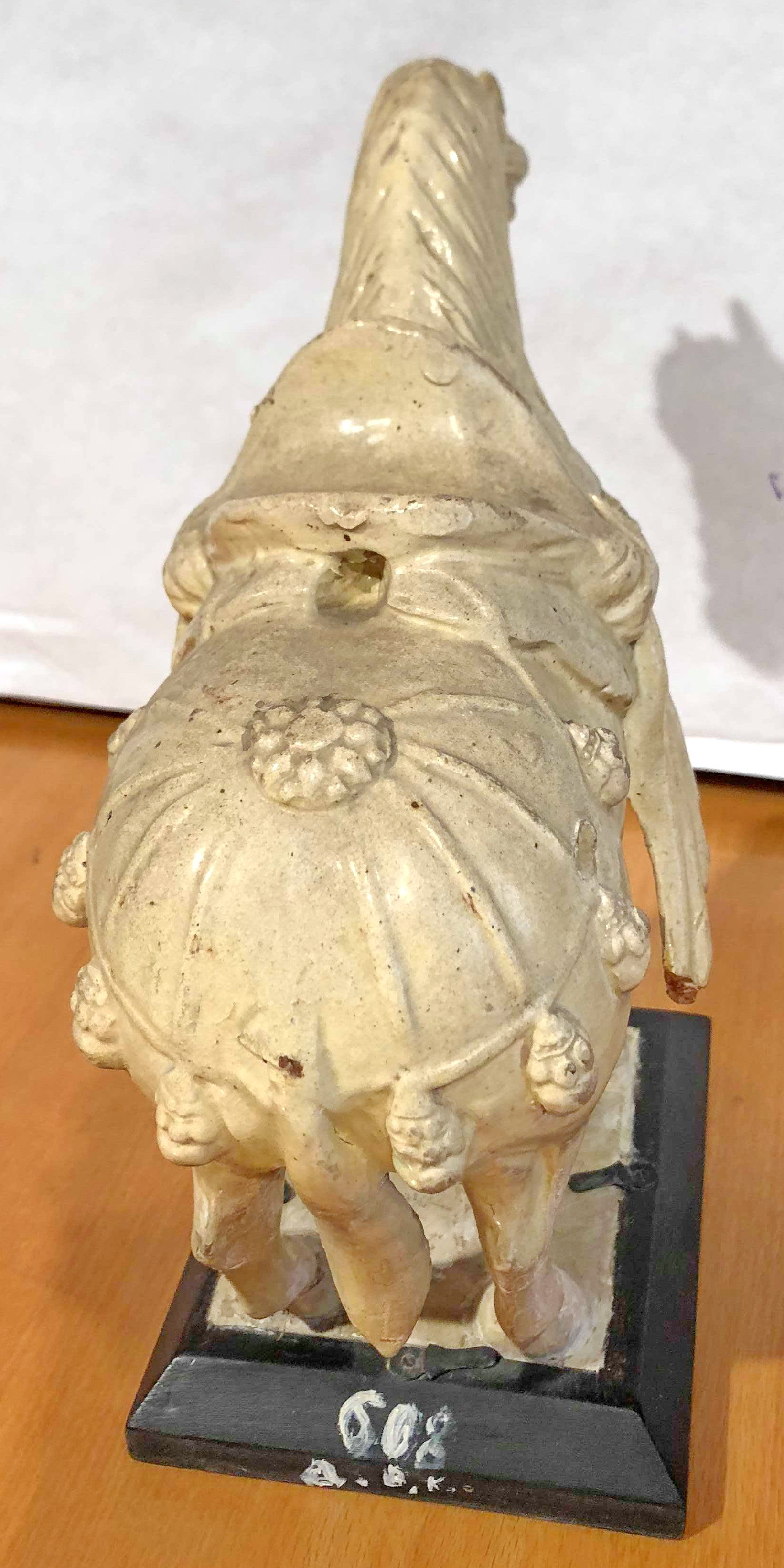 в різних місцях тріщини в поливі, кінець біля сідла відбитий і відсутній, сліди реставрації на ногах.,