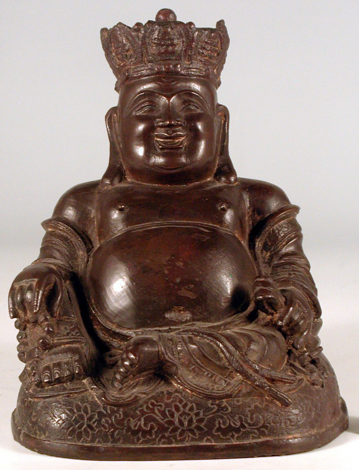 Комм.: Європейська назва "Пу-тай" походить від китайського 布袋和尚 Будай Хешан – дослівно «монах із полотняною торбою». Це втілення Будди Майтрейї, Будди прийдешнього світу, який дарує багатства, згідно китайської народної релігійної традиції. Образ відомий з доби Сун (10-13 ст.)./Історія Атрибуціi: Янь Бода, Тянь Сю, Музей Ґуґун, Пекін, 1963 р.: «Період Мін. Міле» (Міле - китайське ім'я Майтрейї. Примітка Логвин М., 2017)/Кількість: 1/Історія предмета, легенда: Отримано з дирекції художніх виставок і панорам СРСР по акту № 3164 від 04.04.55. Легенда: з колекції Я. Сегеля/Побутування/творiв такого типу: Вівтарна скульптура