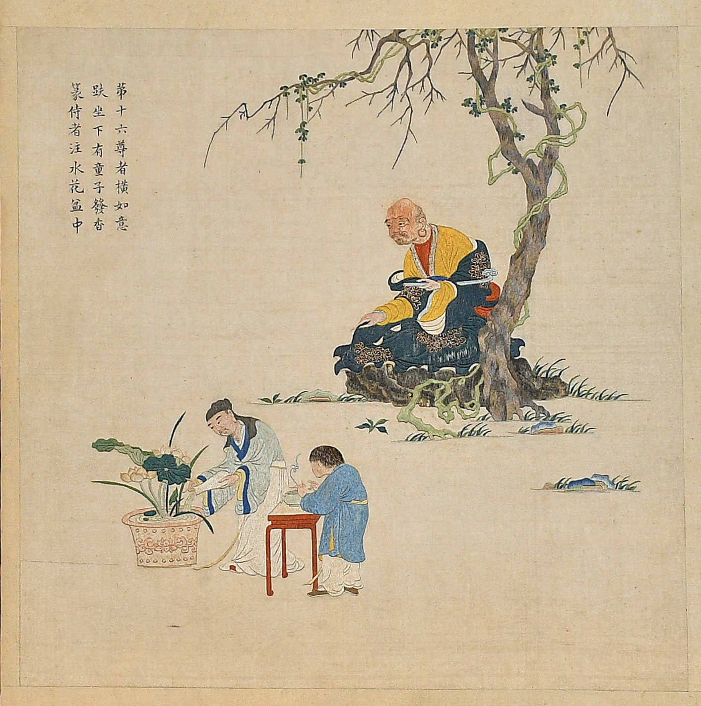 Авторські підписи, клейма: Лівору вгорі 第十六尊者横如意趺坐下有童子发香篆侍者注水花盆中/Кількість: 1