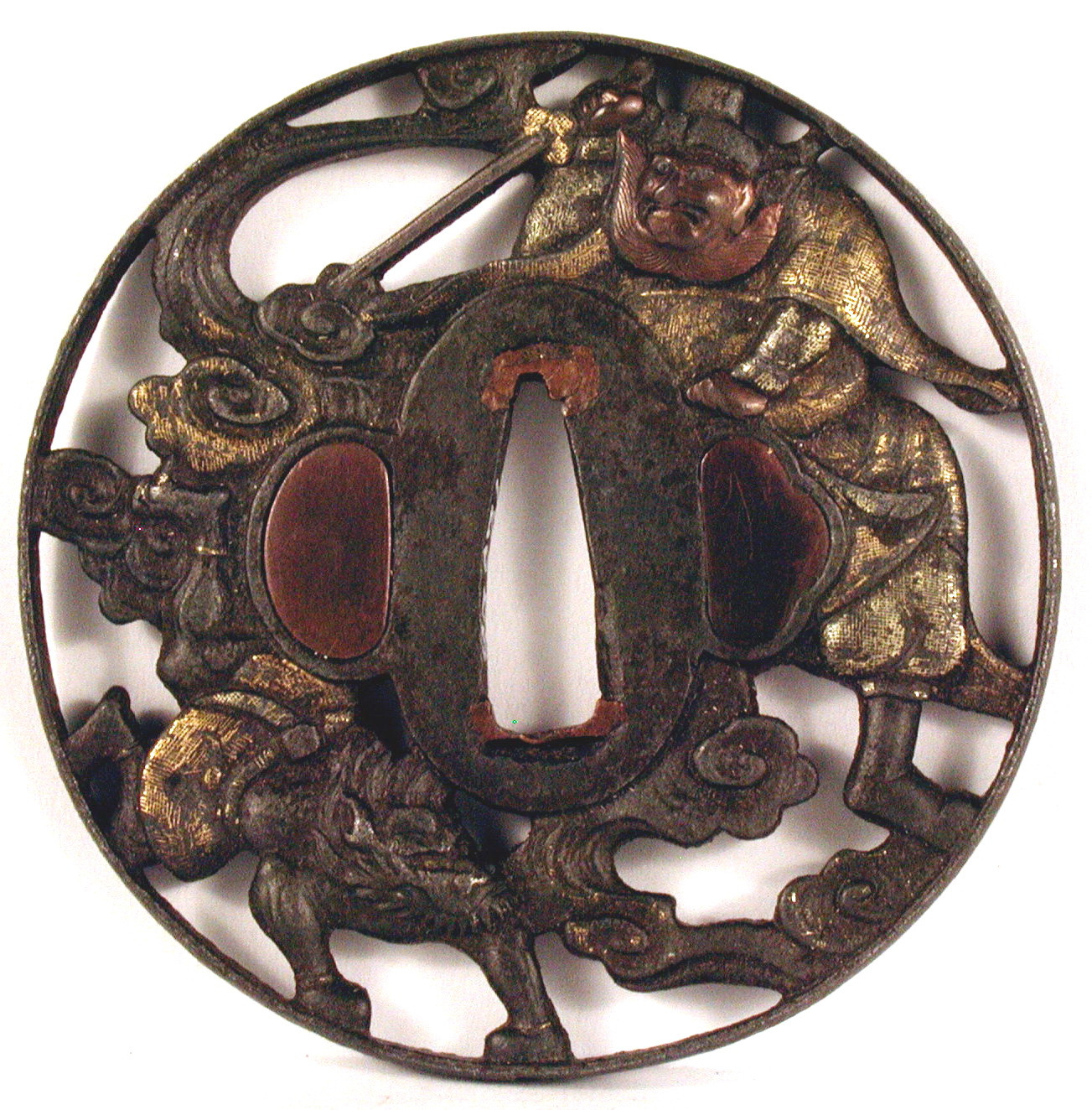 Закладка “Атрибуція” - Наим. предмета, издания: Цуба із зображенням Сьокі – приборкувача демонів/Змiн. розміри: 7,9 х 7,9/Змiн.додаток до назва (лист, ...): Цуба залізна круглої форми мару гата, з тонким гладким ободом мімі. Має три отвори ріо хіцу (отвори когаі та кодзука хіцу ана закриті металевими пластинами). Декор виконано ажурним різьбленням і двостороннім моделюванням: зображено праворуч Сьокі (китайського Чжун Куя), ліворуч – демона./Змiн. час створення: Кінець 18 – перша половина 19 ст.Новый материал: залізоНовый материал: бронзаНовый материал: дорогоцінні металиИзм. техника: куванняИзм. техника: різьбленняИзм. техника: гравіруванняИзм. техника: інкрустація