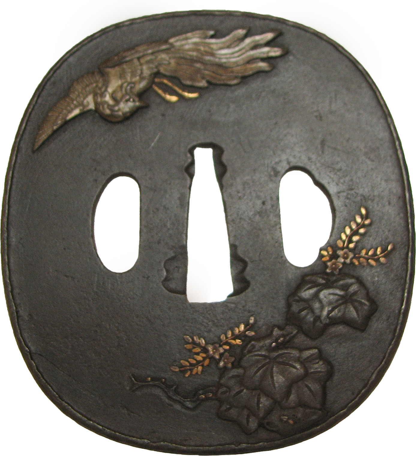 Закладка “Атрибуція” - Наим. предмета, издания: Цуба із зображенням фенікса та квітучої павлонії/Змiн. розміри: 7,7 х 8,5 х 8,7 см/Змiн. час створення: 18 ст.Автор, автор съемки: Невідомий майстерИзм. техника: куванняИзм. техника: гравіруванняИзм. техника: інкрустація бронзоюмісце створення, школа: Японія