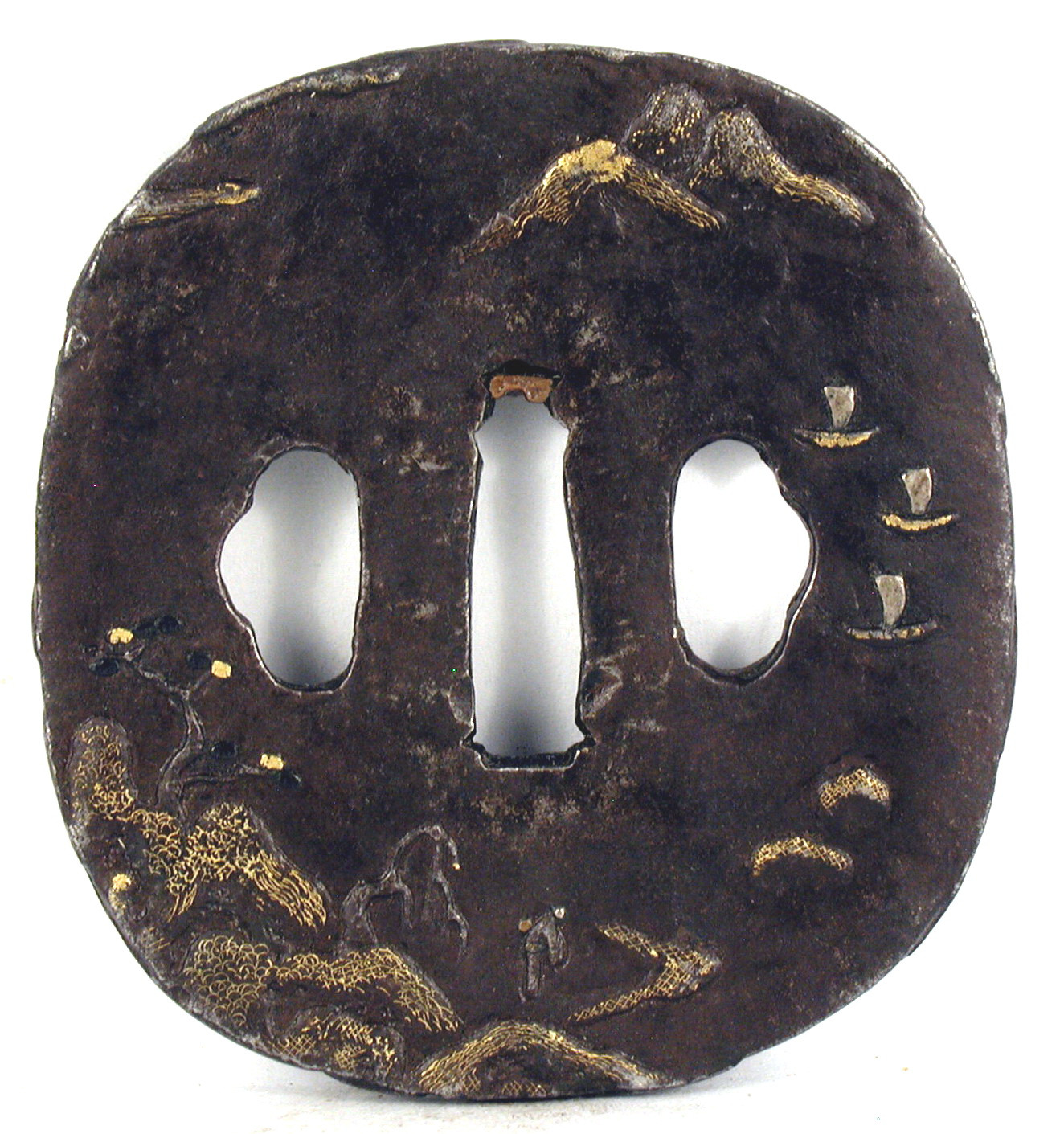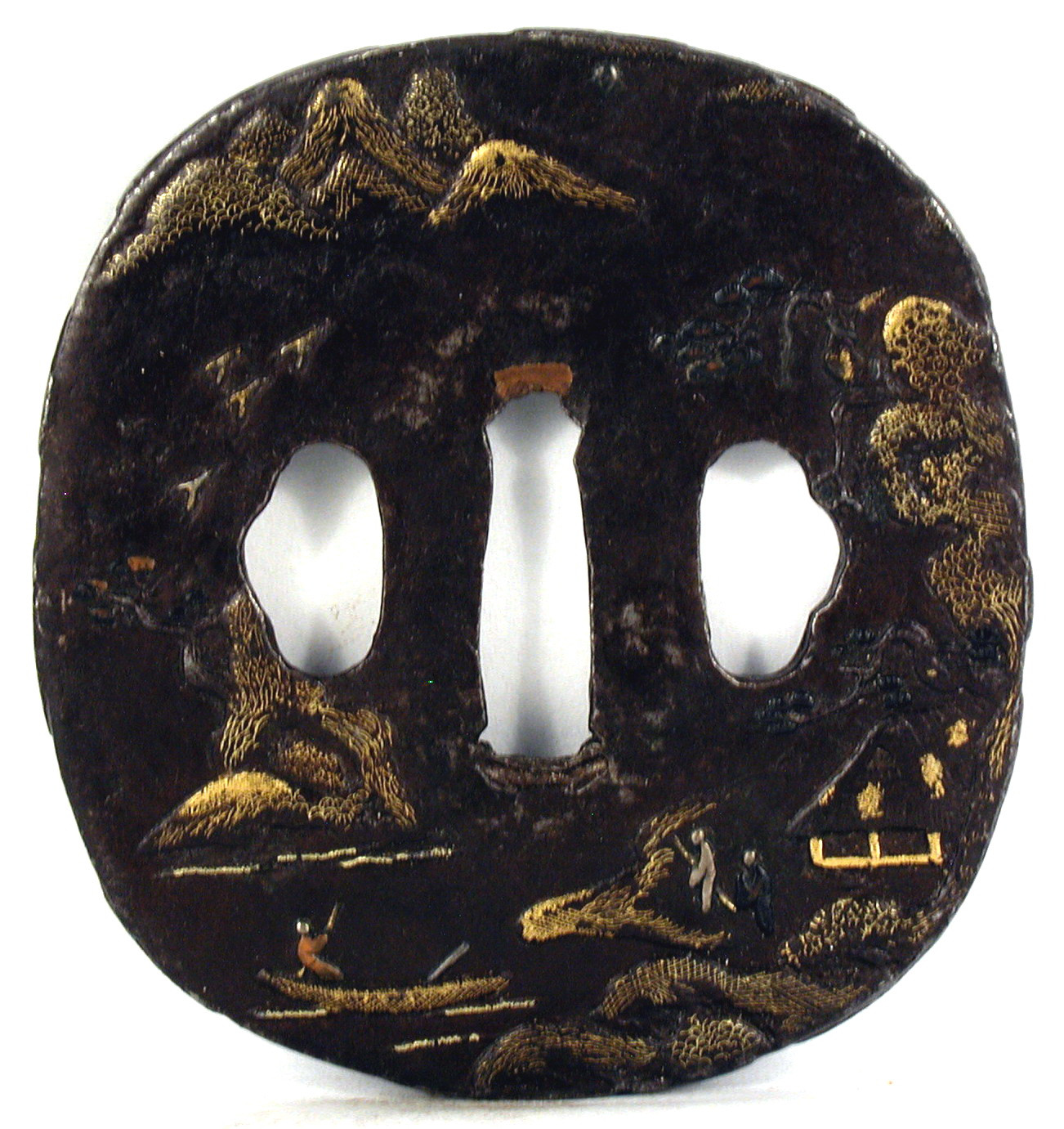 Закладка “Атрибуція” - Наим. предмета, издания: Цуба із зображенням краєвиду/Змiн. розміри: 8,4 х 7,5 см/Змiн.додаток до назва (лист, ...): Цуба залізна, близької до овалу форми аорі гата з трьома отворами ріо хіцу ана, з тонким рельєфним краєм. На аверсі зображено пейзаж з човном на річці внизу і горами вгорі. На реверсі – три парусні човни на річці і гори./Змiн. час створення: 18 ст.Автор, автор съемки: Майстер школи ДзякушіИзм. техника: куванняИзм. техника: патинуванняИзм. техника: різьбленняИзм. техника: гравіруванняИзм. техника: накладний рельєфИзм. техника: насічкаИзм. техника: золоченняИзм. техника: срібленнямісце створення, школа: м. НагасакіНовый материал: залізоНовый материал: мідний сплавНовый материал: сріблоНовый материал: дорогоцінні метали