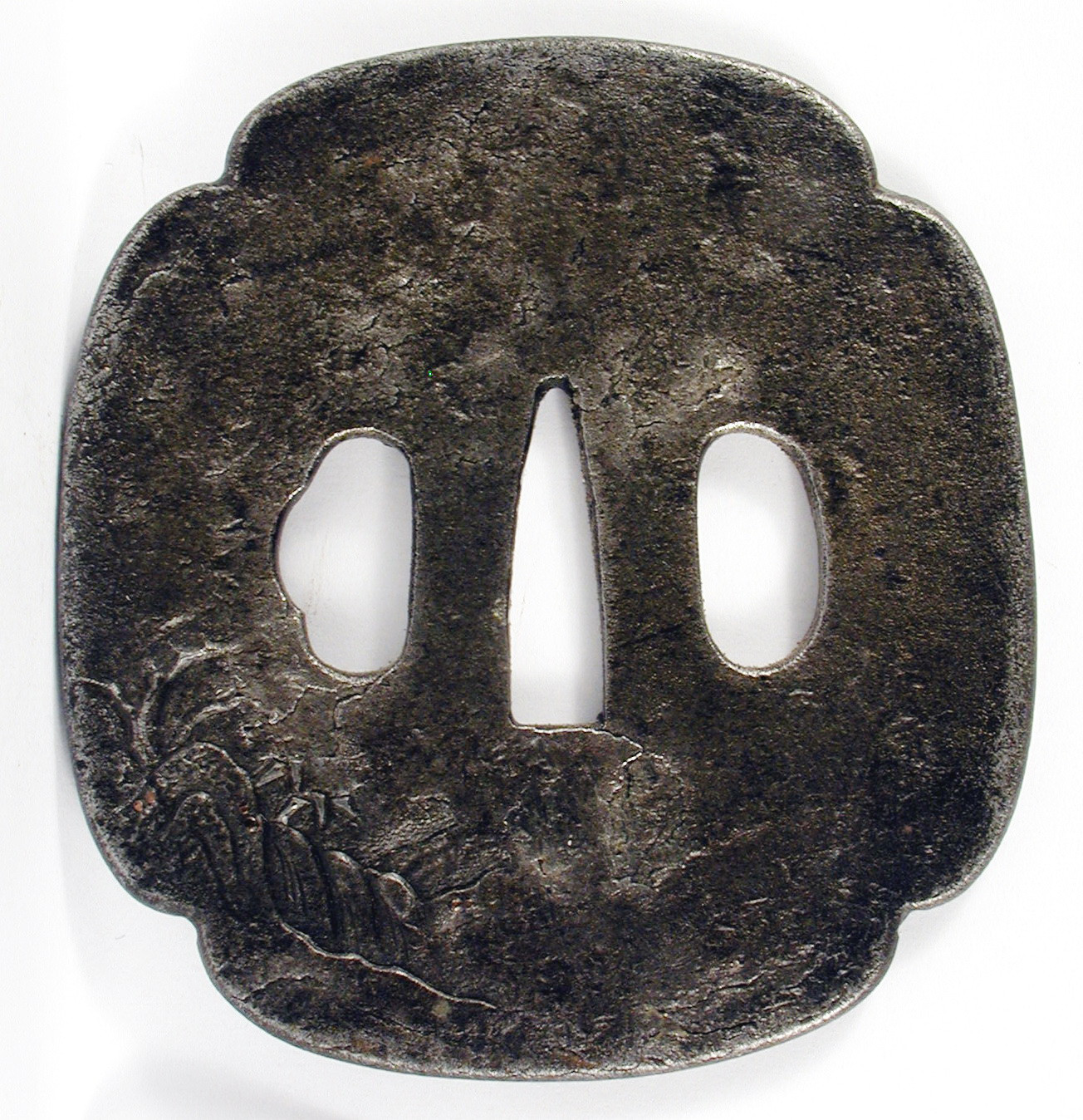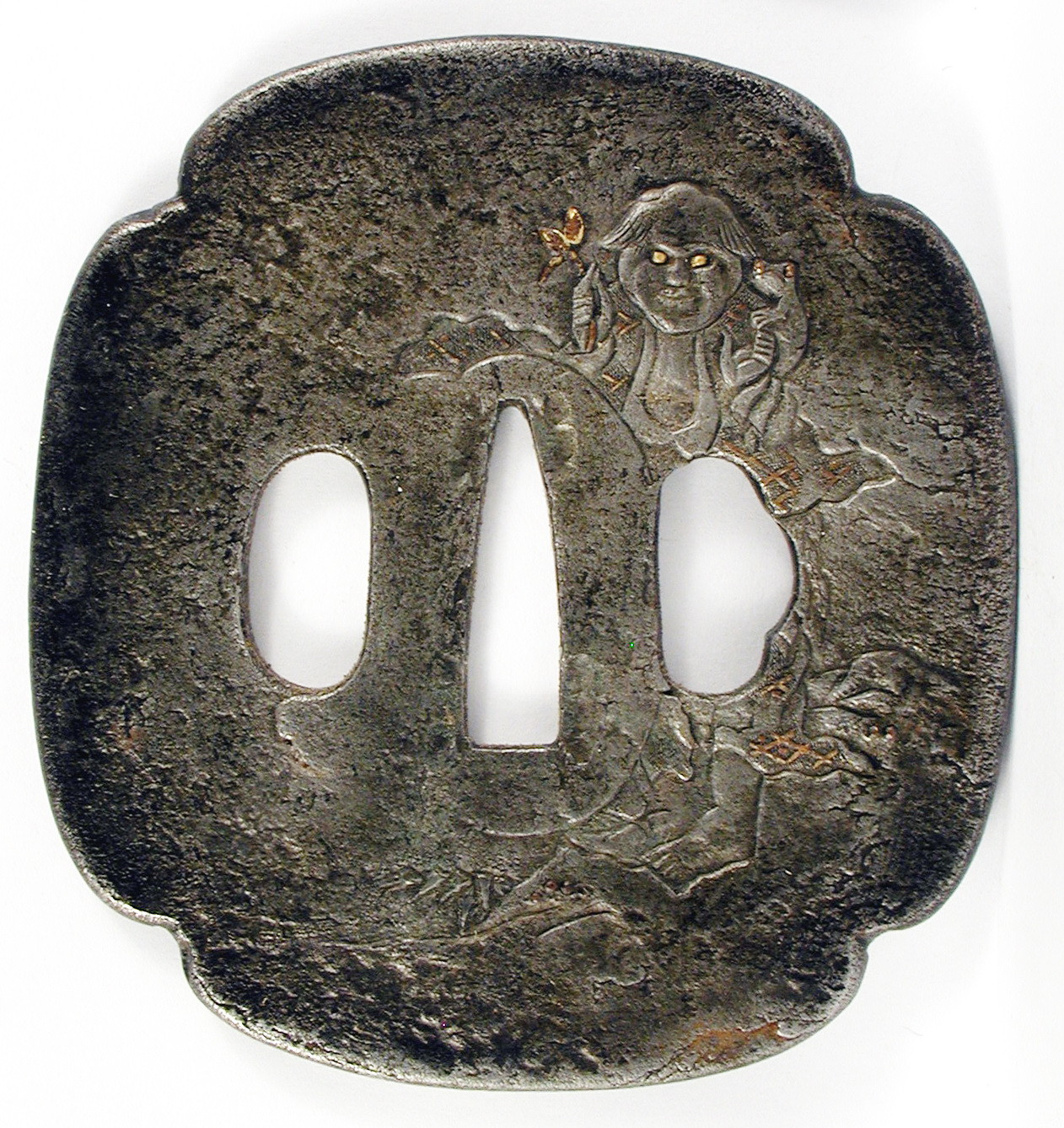 Закладка “Атрибуція” - Наим. предмета, издания: Цуба із зображенням святого Гама сенніна із жабою та краєвиду/Змiн. розміри: 9,9 х 8,6 х 9,5 см/Змiн.додаток до назва (лист, ...): Цуба залізна мокко форми з тонким рельєфним краєм мімі, має три отвори ріо хіцу. На аверсі зображено Гама-сенніна з жабою на плечі. На реверсі – фрагмент пейзажа з водоспадом./Змiн. час створення: 17 ст.місце створення, школа: стиль КанеіеИзм. техника: куванняИзм. техника: гравіруванняИзм. техника: інкрустаціяНовый материал: залізоНовый материал: мідний сплав