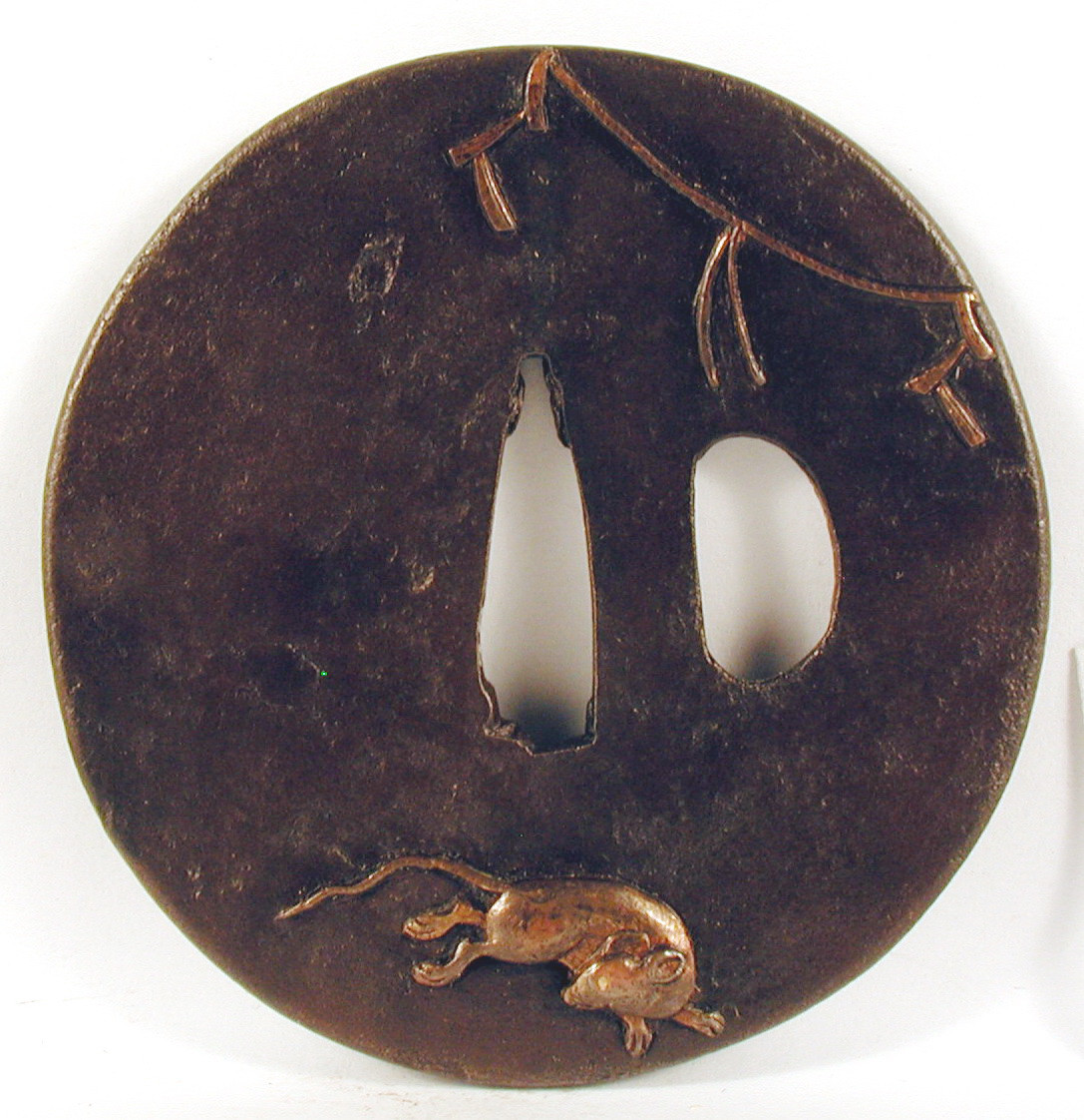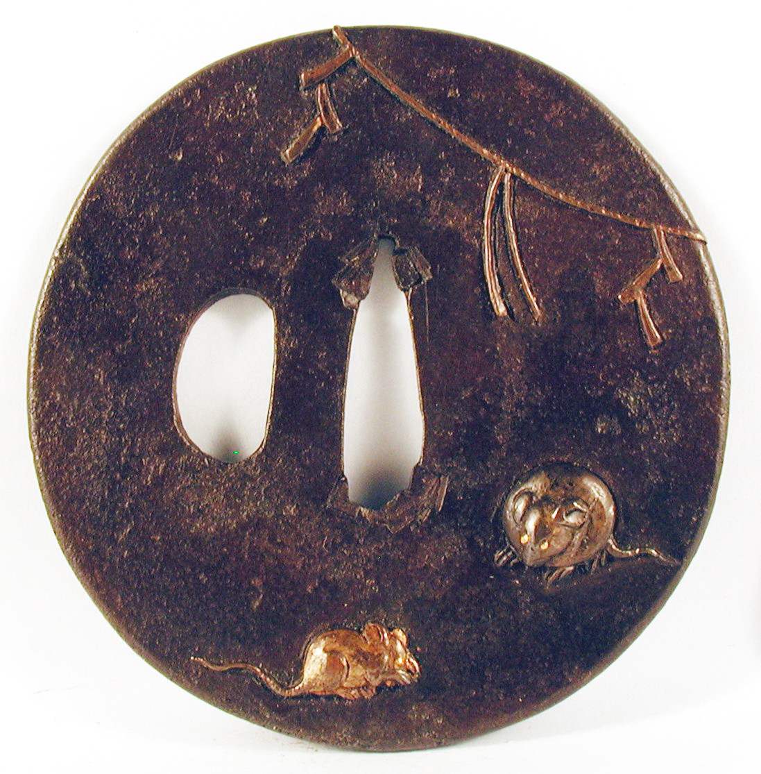 Закладка “Атрибуція” - Наим. предмета, издания: Цуба із зображенням щурів і новорічної мотузки сіменава/Змiн.додаток до назва (лист, ...): Цуба залізна, кругла (maru gata), з двома отворами: nakago та kozuka hitsu ana; має тонкий рельєфний обід (mimi). На аверсі зображено двох щурів і верху над ними священну рисову мотузку сіменава. На реверсі – щур і сіменава./Змiн. час створення: Перша половина 18 ст.Автор, автор съемки: Невідомий майстермісце створення, школа: стиль школи НараНовый материал: залізоНовый материал: бронзаИзм. техника: куванняИзм. техника: накладний рельєфИзм. техника: гравіруванняИзм. техника: інкрустація золотомНовый материал: дорогоцінні метали