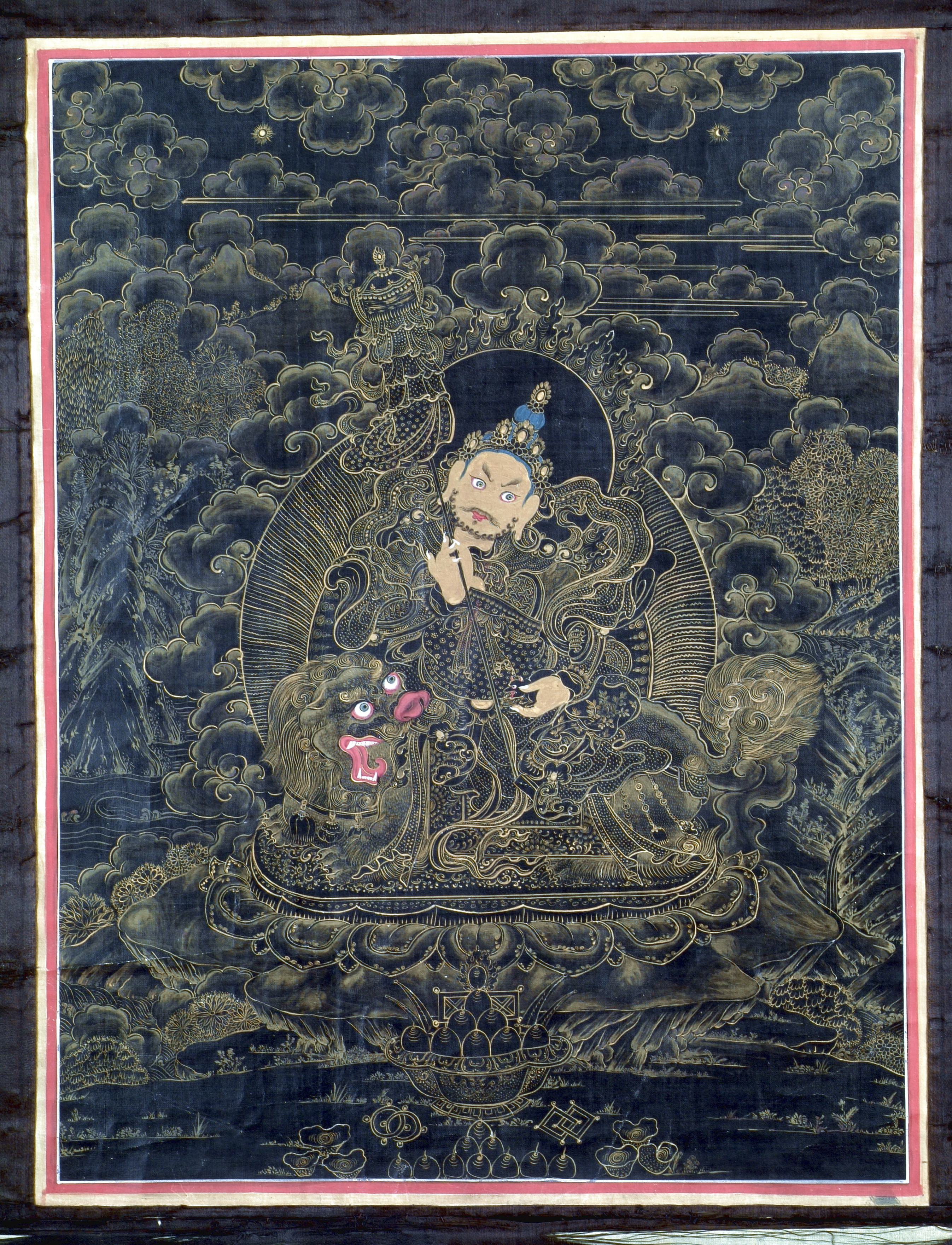 Історія Атрибуціi: 1959 р., Реріх Ю.М., Інститут сходознавства АН СРСР: Східний Тибет, XVIII ст./Кількість: 1/Опис: Вайшравана (санскр., тиб. Намтойре)/Опис обрамления, постамента: Жовто-червона райдуга, обрамлення чорного сатину/ншi написи, штампи, печатки, етикетки, наклейки: Написи на звороті (кіновар’ю): по вертикалі згори вниз тібетські сакральні формули: “OM”, “ĀH”, “HŪM”.