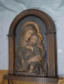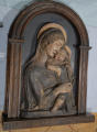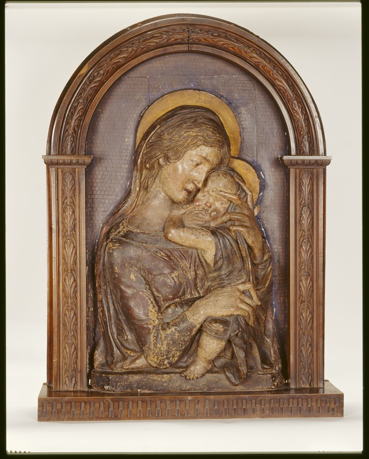 4) W.Bode "Florentiner Bildhauer der Renaissance". ст. 114, табл. 47/Кількість: 1/Опис: Поясне зображення Мадонни, що притискає до себе немовля Христа. Її скорботне обличчя з напіввідкритим ротом повернуто на 3/4 вправо. Розпущене волосся її зображено широкими хвилястими лініями. Немовля в темно-сірому одязі без рукавів. Мадонна вдягнена в червонувато-коричневий хітон і мафорій, краєм якого вона огортає немовля. Немовля Христос зображений на повний зріст в живій грайливій позі; пальцем правої руки він торкається рота. Навколо голів - золоті німби. Тло (дороблене пізніше) - сірувато-синє. Горельєф вставлений в дерев'яну раму у вигляді напівциркульної арки, яку підтримують пілястри.
