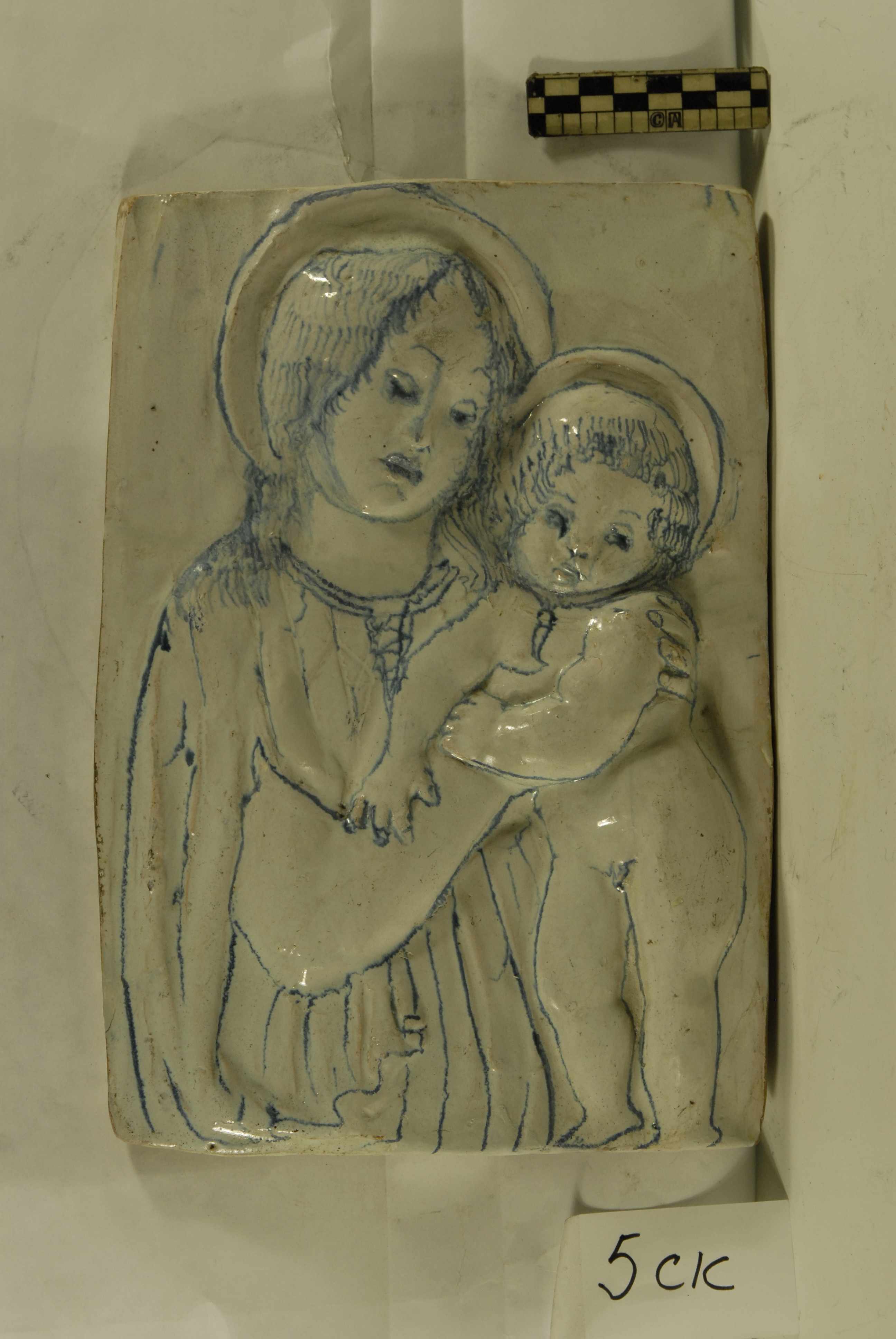 Кількість: 1/Опис: Майже поколінне зображення Мадонни в одязі, що спускається прямимі спокійно спадаючими складками. Обличчя її трохи звернуте вправо. Вона підтримує оголеного немовля, який сточи на повний зріст, спирається на її руку. Рельєф поданий в білому тоні, малюнок нанесений синіми лініями.