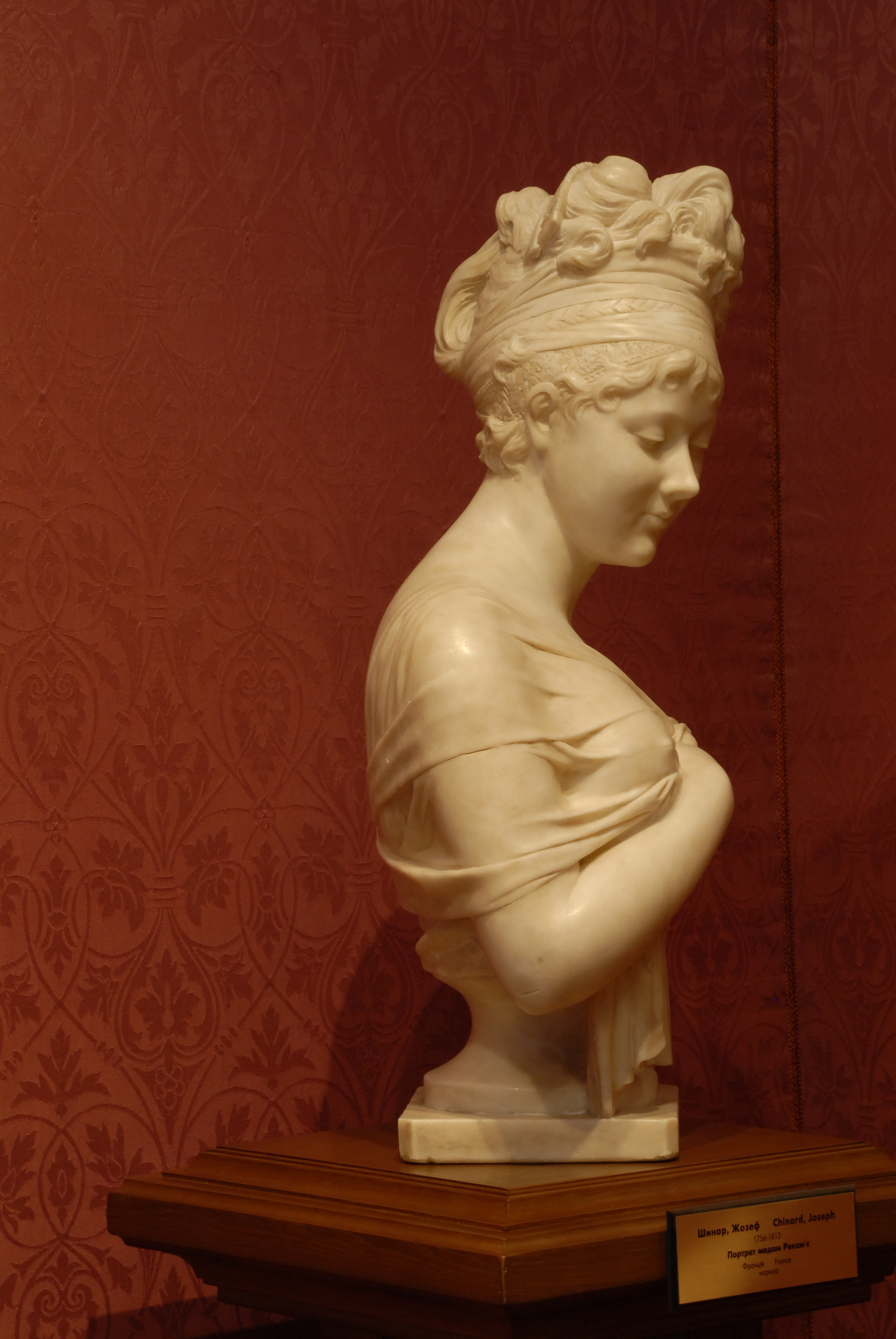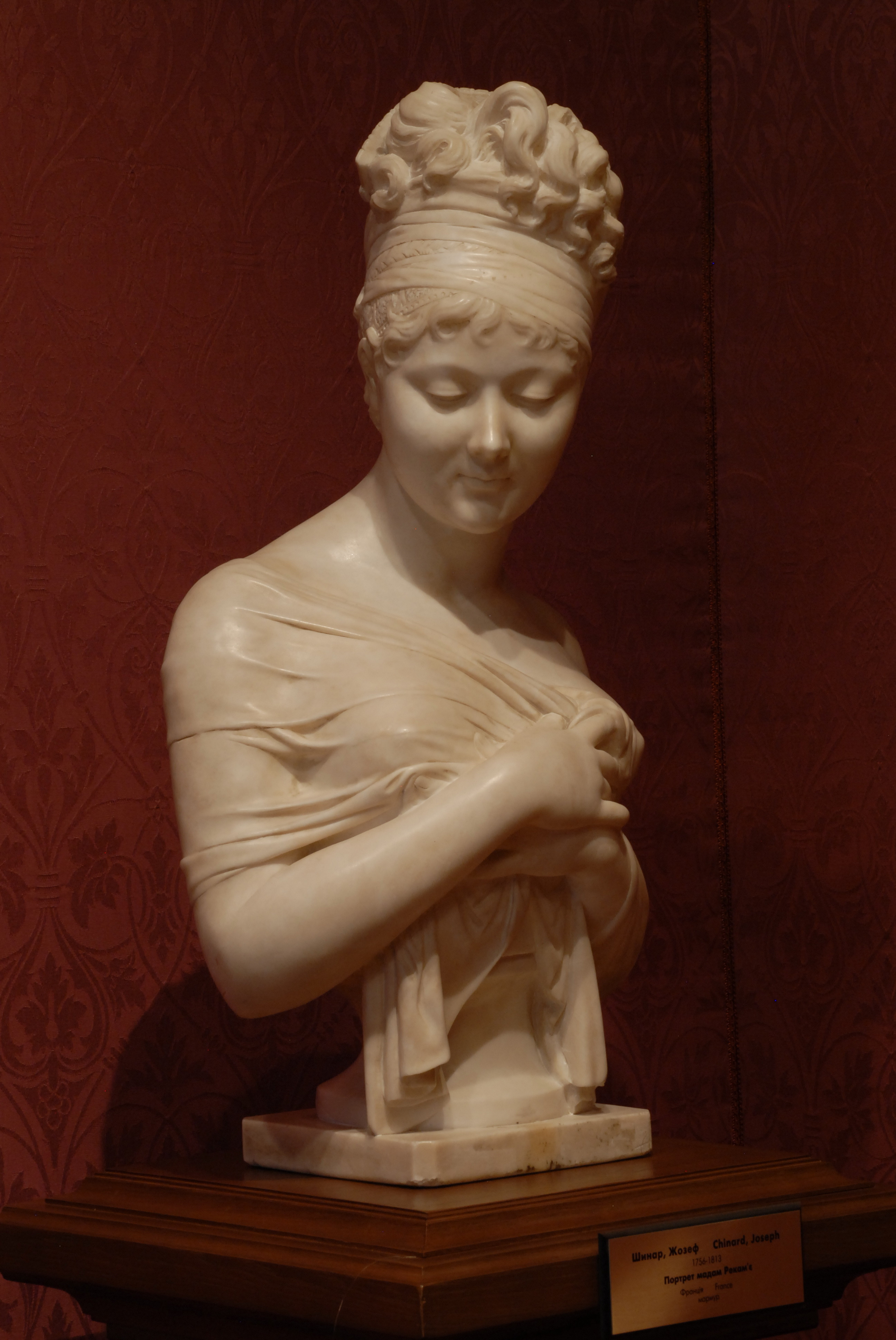 Кількість: 1/Історія предмета, легенда: Передана з музею російського мистецтва в 1935р./Опис: Поясне зображення молодої жінки. Двома руками вона підтримує на грудях легкий шарф, що спадає з плеча і залишає відкритою її ліву грудь. Широка пов'язка підтримує її складну зачіску з високо піднятими спереду локонами. Голова її повернута вправо і злегка нахилена; на обличчі грає легка посмішка.