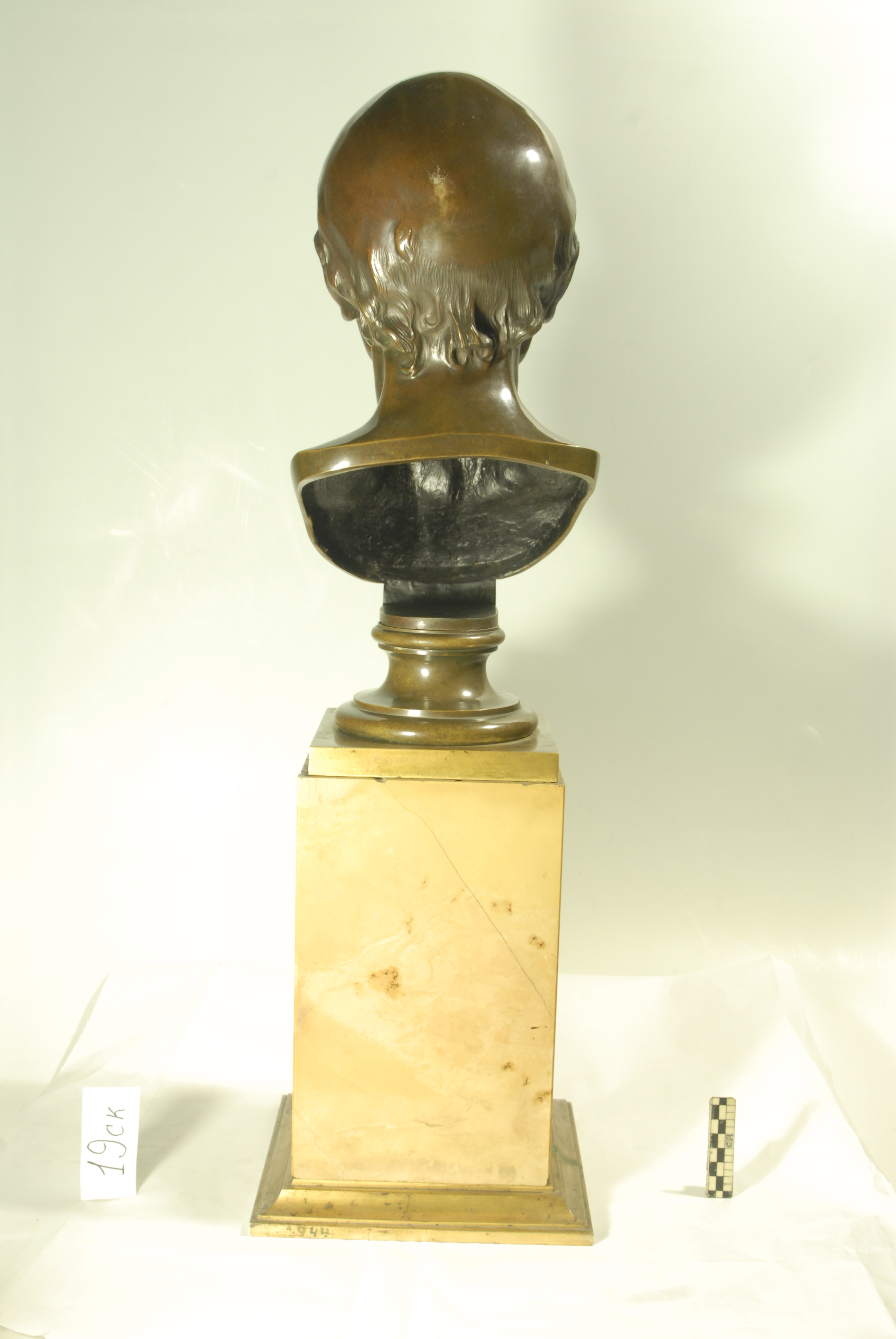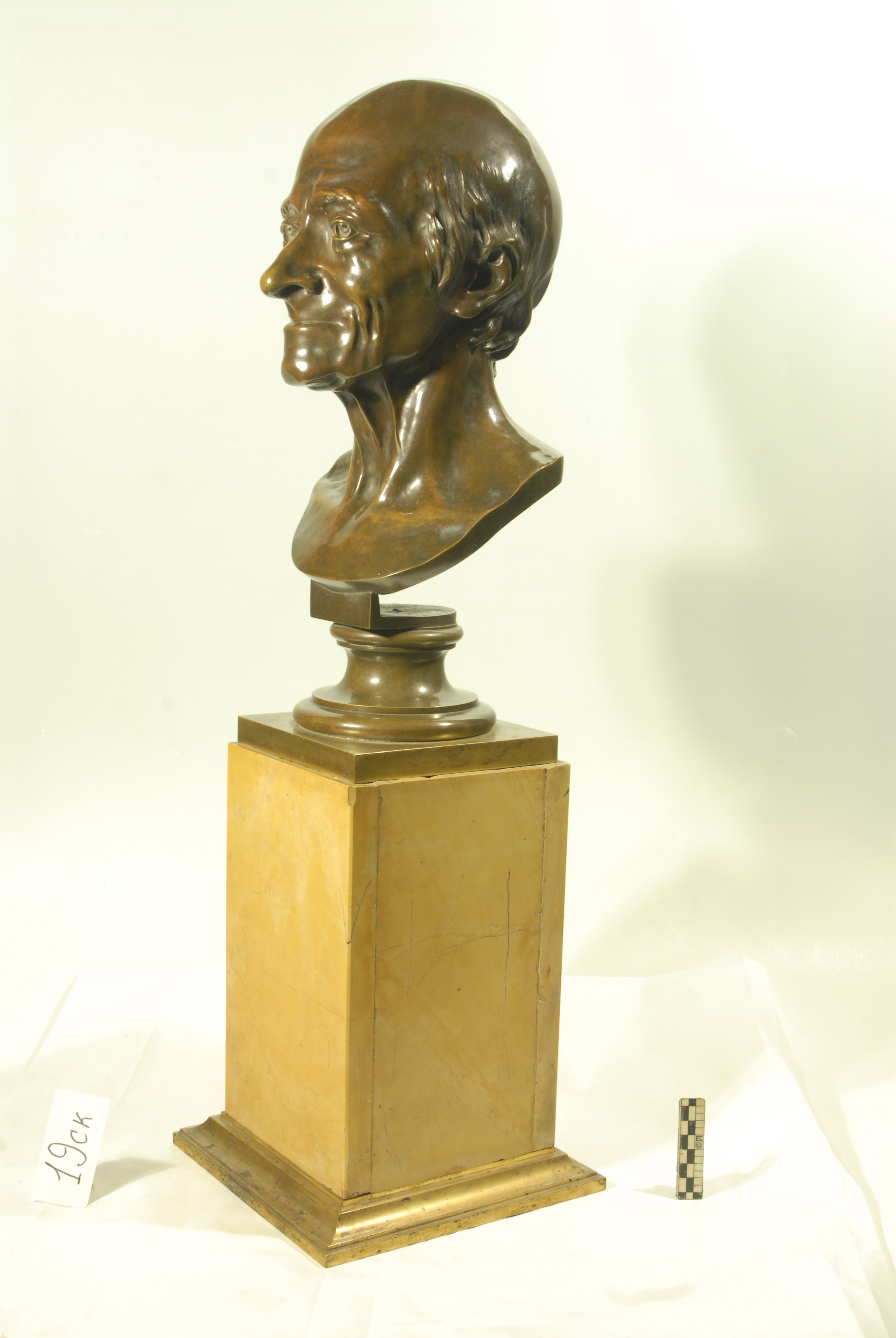 Авторські підписи, клейма: Houdon/Кількість: 1/Історія предмета, легенда: Куплена у гр.Тіщіна з м.Києва в 1937р./Опис: Відлив з бронзової голови, що зберігається в Луврі. Одна з підготовчих робіт Гудона (1779 р.) до статуї "Вольтер в кріслі". З лівого боку на зрізі бюста підпис: Houdon.