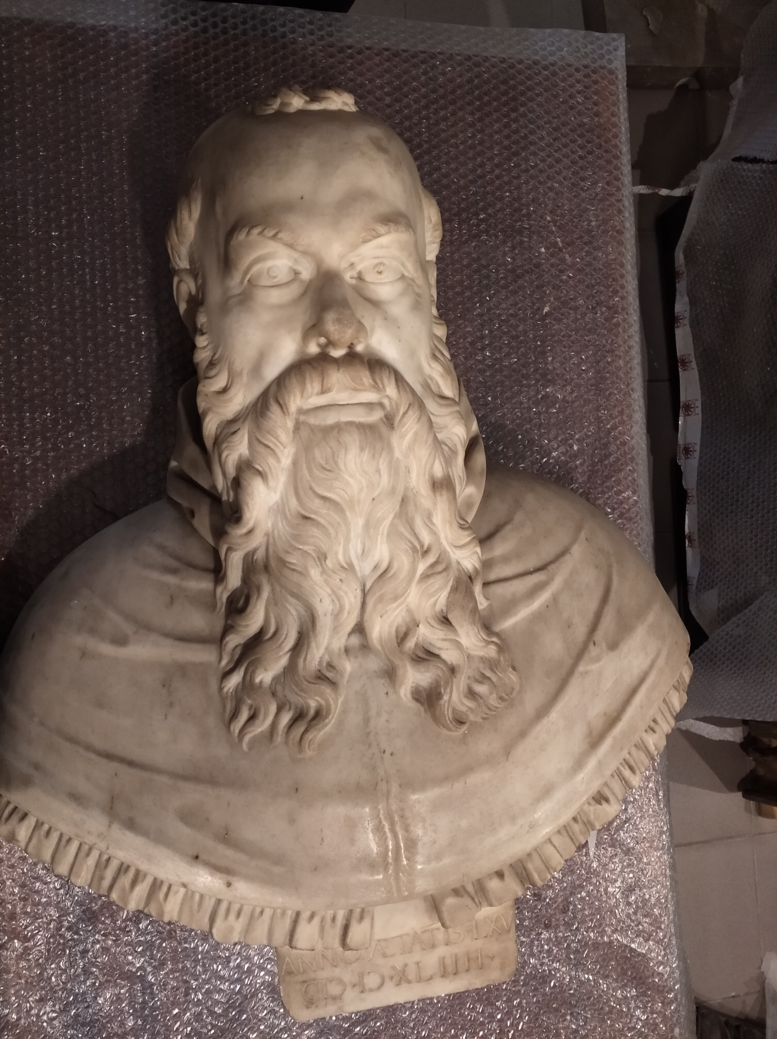 Кількість: 1/Опис: Погрудне зображення літньої людини з довгою бородою і звисаючими донизу великими вусами. Очі його широко відкриті, обличчя суворе й нерухоме. На голові велика тонзура. Пелерина його кардинальської мантії завершує форму бюста. Зображення підкреслено фронтальне. На постаменті висічений напис:
