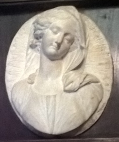 Кількість: 1/Історія предмета, легенда: Придбаний із зібрання Альберіччі в Римі/Опис: Погрудне зображення молодої дівчини зі схиленою вліво головою. Очі її напівзакриті, на обличчі ледве помітна усмішка. На її хвилясте волосся накинуто покривало, що спадає на спину і на ліве плече. Голову її оточує сяйво у вигляді променів, поданих в легкому рельєфі.