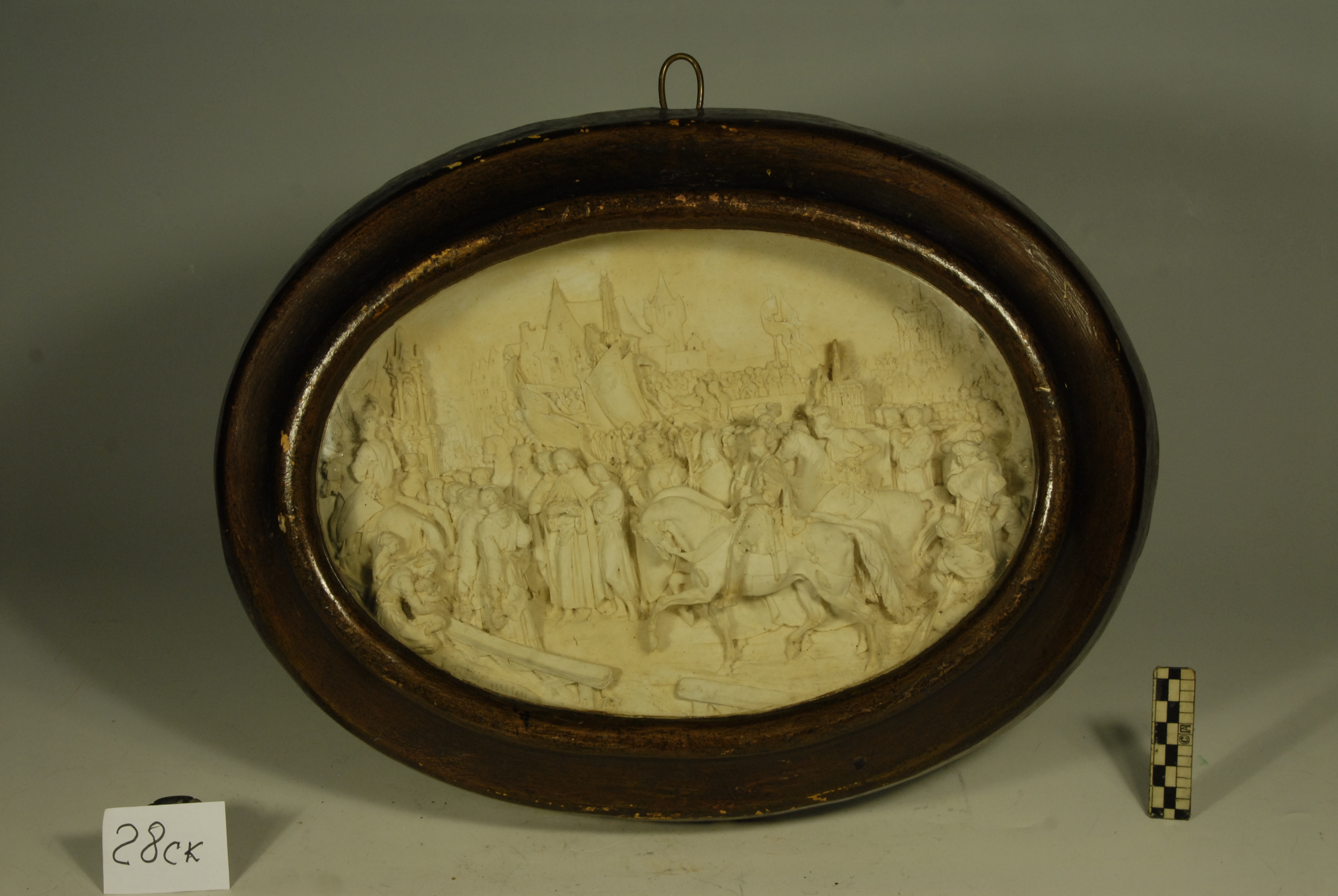 Кількість: 1/Історія предмета, легенда: Придбаний у гр.Рибаченко Л. з м.Києва, акт №7 від 29.06.1946р/Опис: Зліва піші лицарі, які наступають, тільки що зійшовши з кораблів і ступивши на берег. У центральній частині - лицарі, наступаючи суцільною стіною, тіснять і звертають на втечу ворогів, що перевершують їх за чисельністю. На передньому плані лицар, стоячи на крупі коня, який впав, загрожує високо занесеним мечем вершнику на здибленому коні. На другому плані, зліва сарацини, що біжать і збентежені призупиняються. Вдалині - група сарацинських стрільців, які пускають у лицарів стріли. На задньому плані східне місто на тлі гір і пальм.
