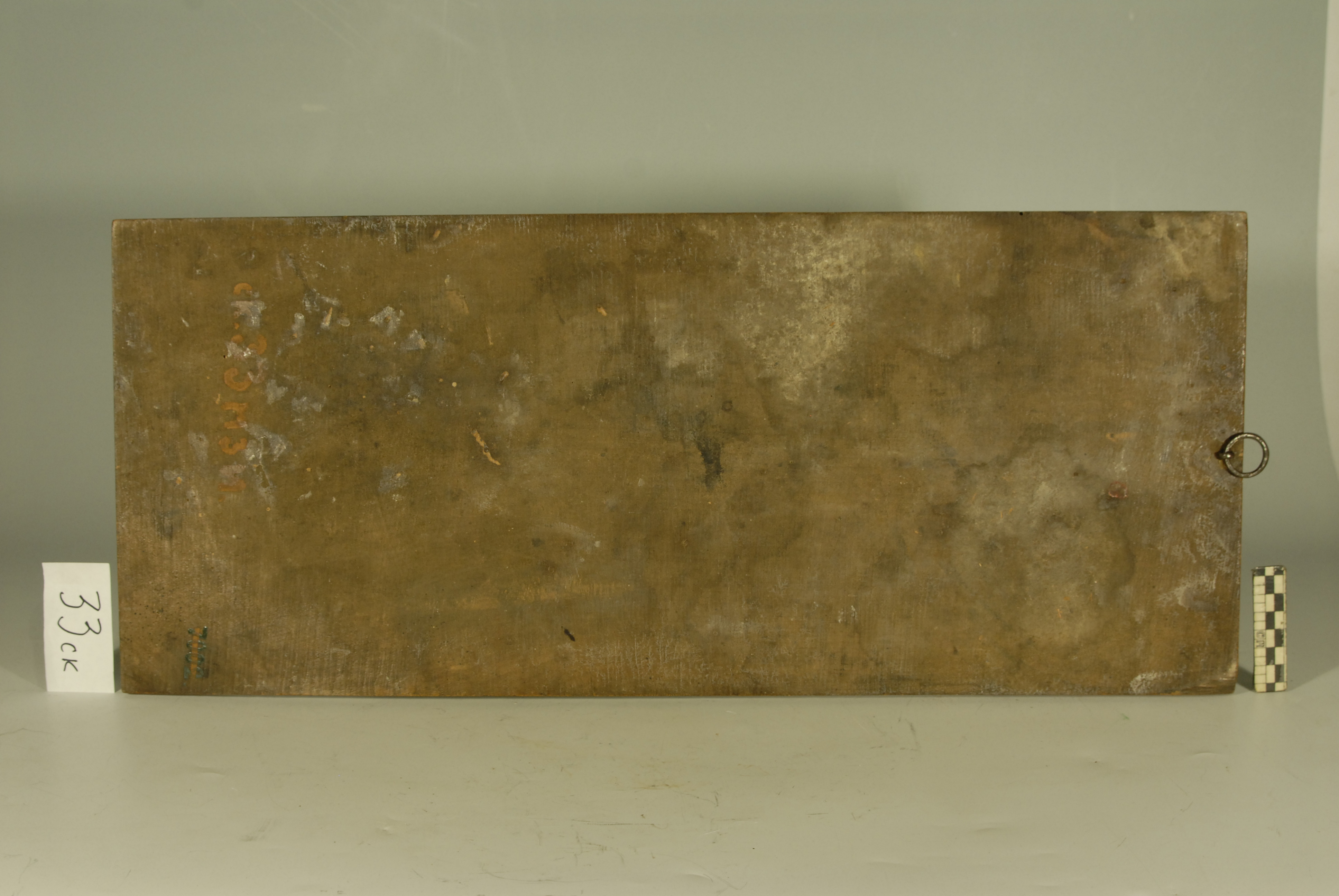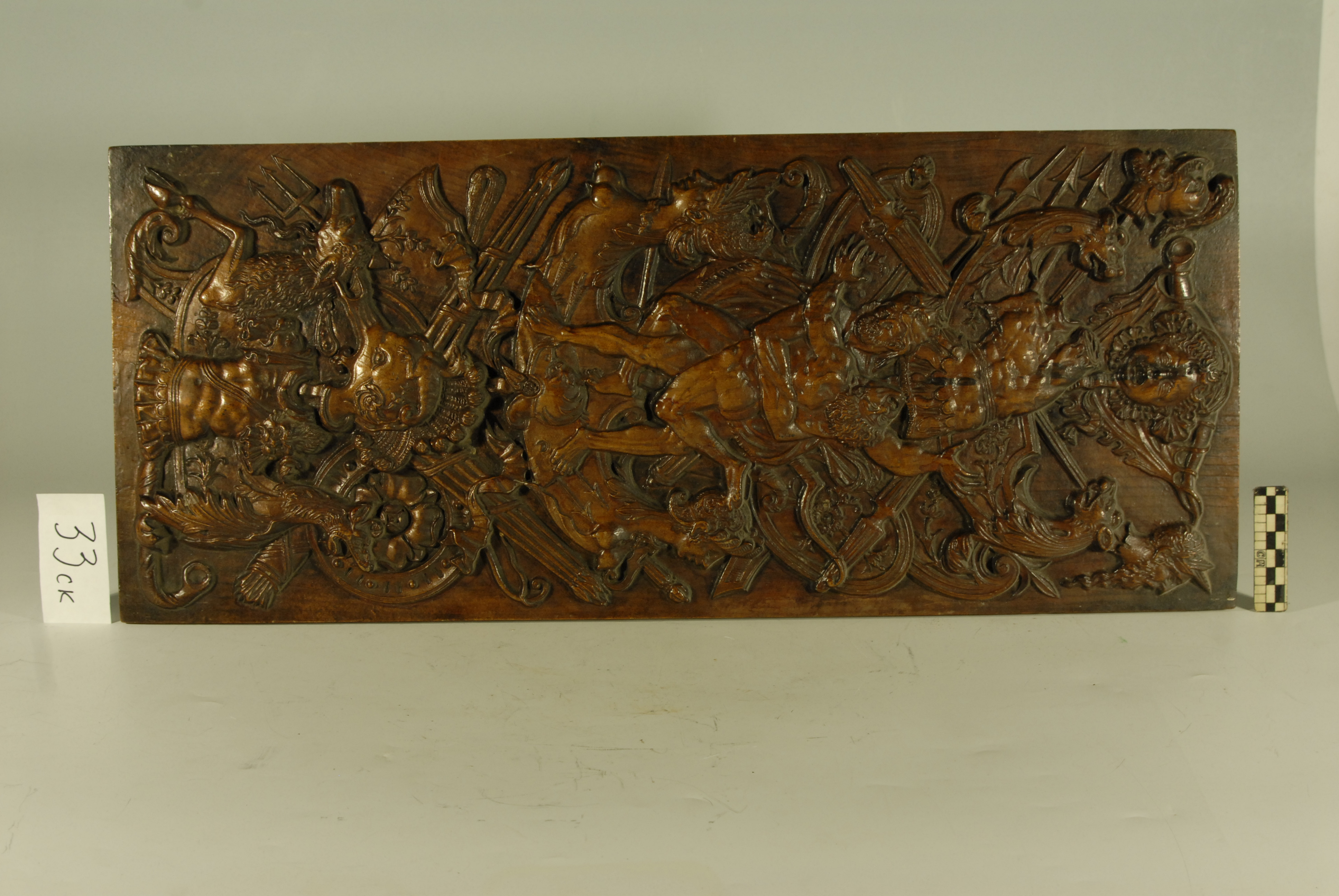 Кількість: 1/Історія предмета, легенда: Придбана в 1938 році в м.Києві/Опис: Серед дуже складного орнаменту, що складається з різних трофеїв - лицарських обладунків, шоломів, списів, а також грифонів, сирен, голів Цербера, в центрі композиції зображено боротьбу Геракла з Антеєм. Геракл з лев’ячою шкурою на голові стискає Антея, який звивається в його руках зі спотвореним від болю обличчям і розставленими руками. Верхня частина барельєфа завершується маскароном у вигляді голови путті, що плаче.