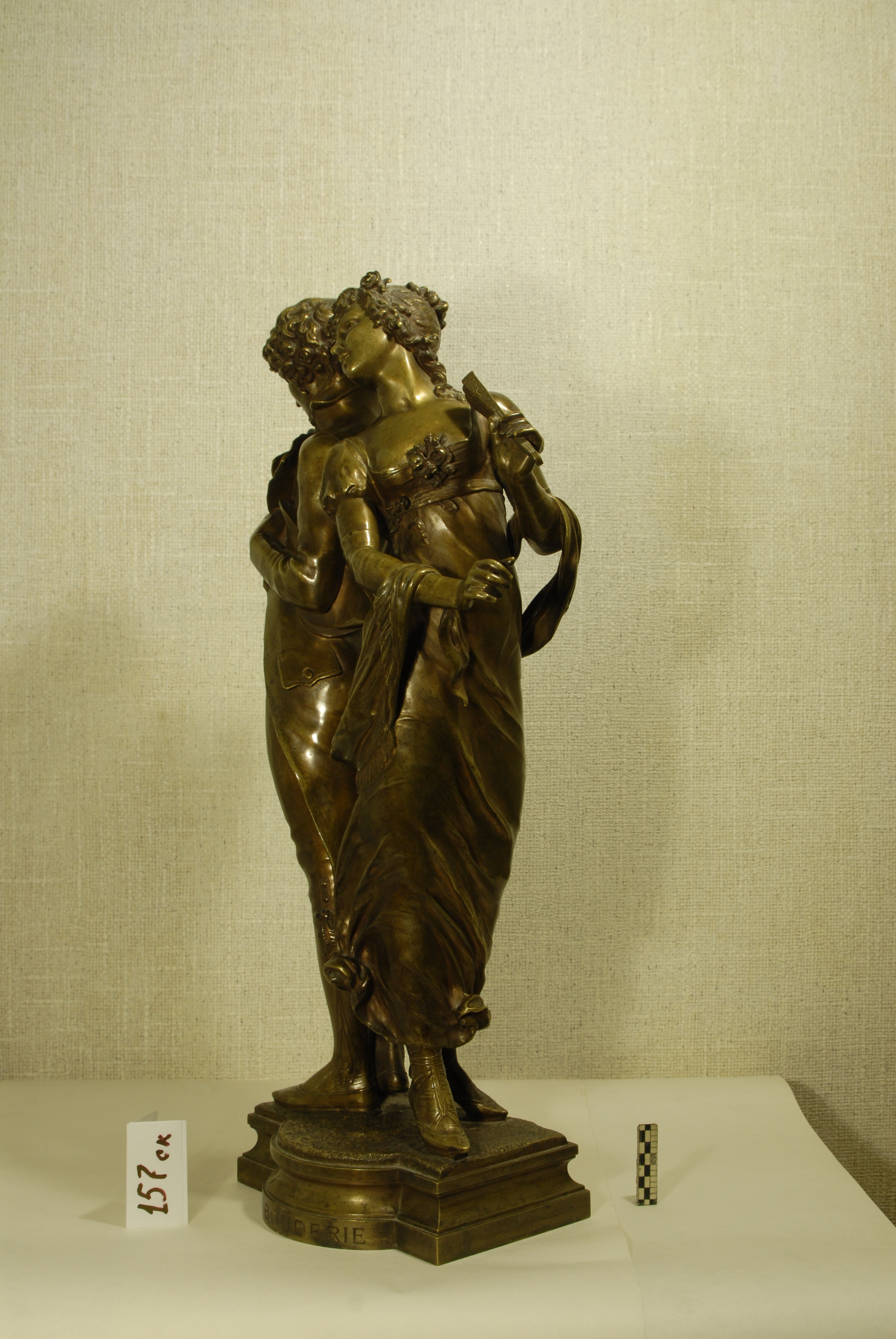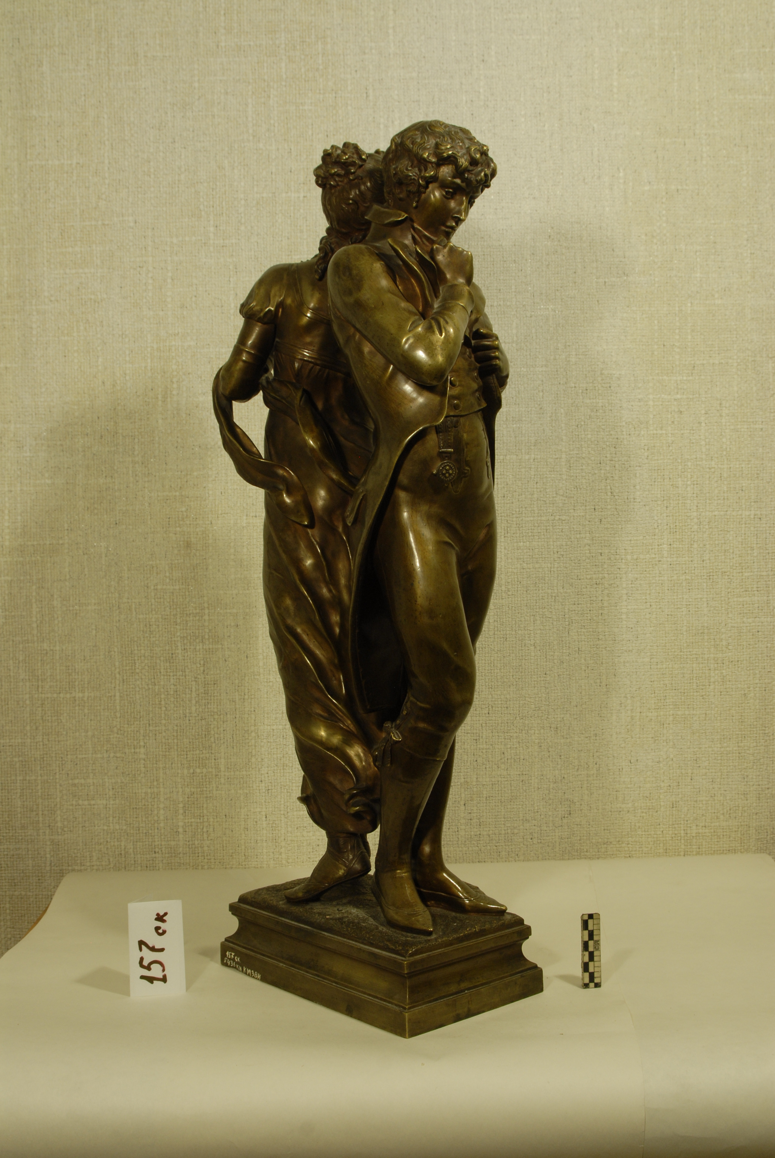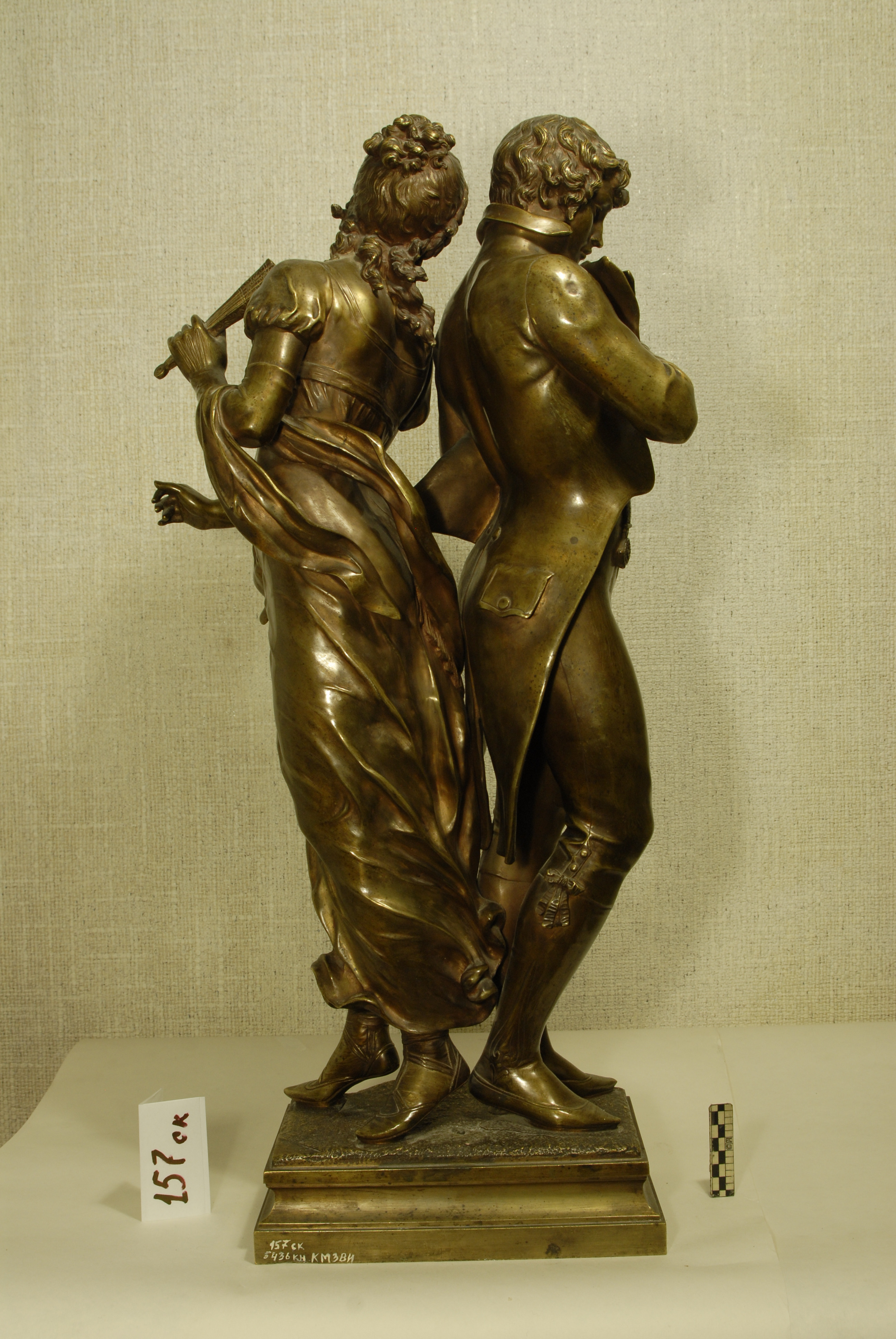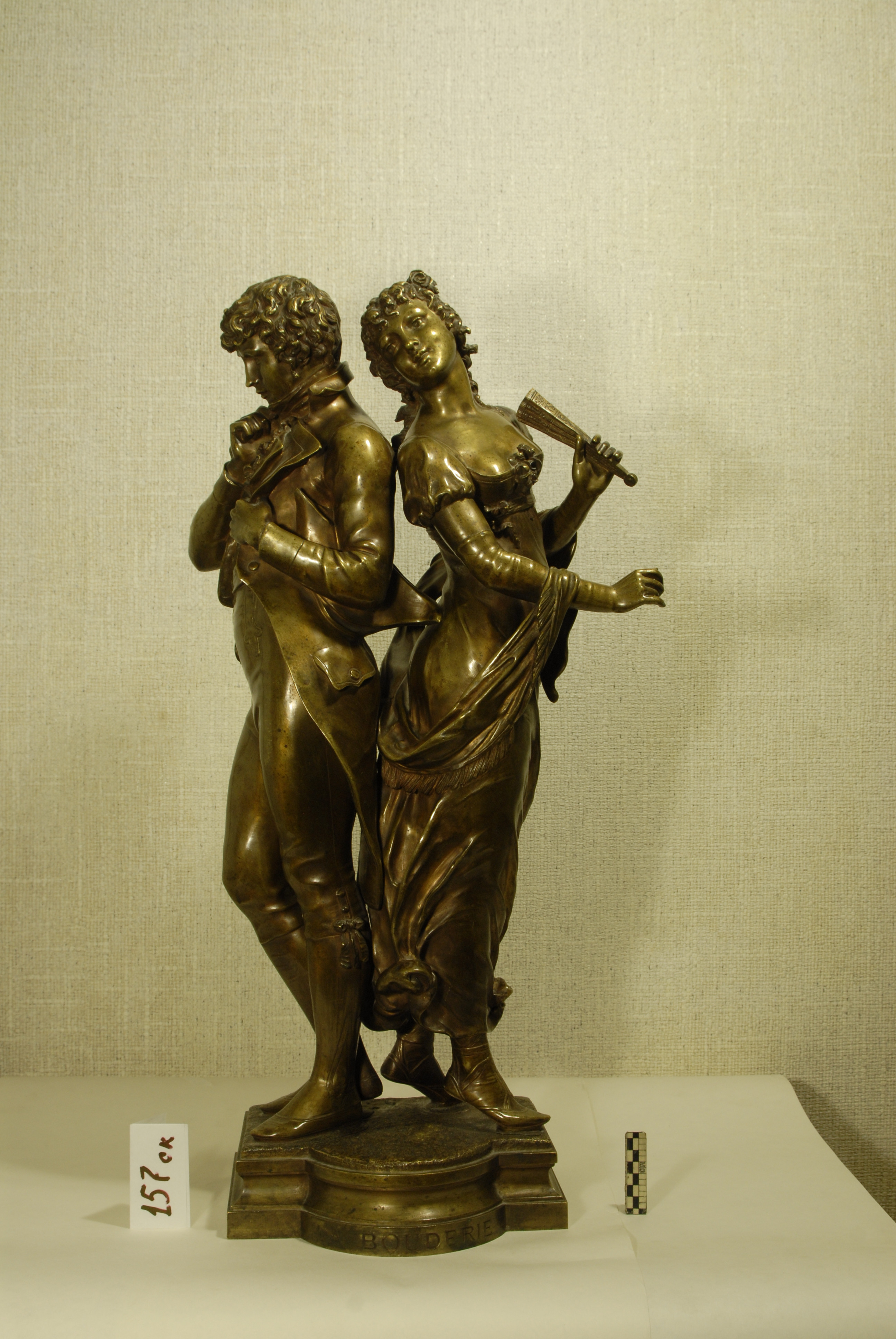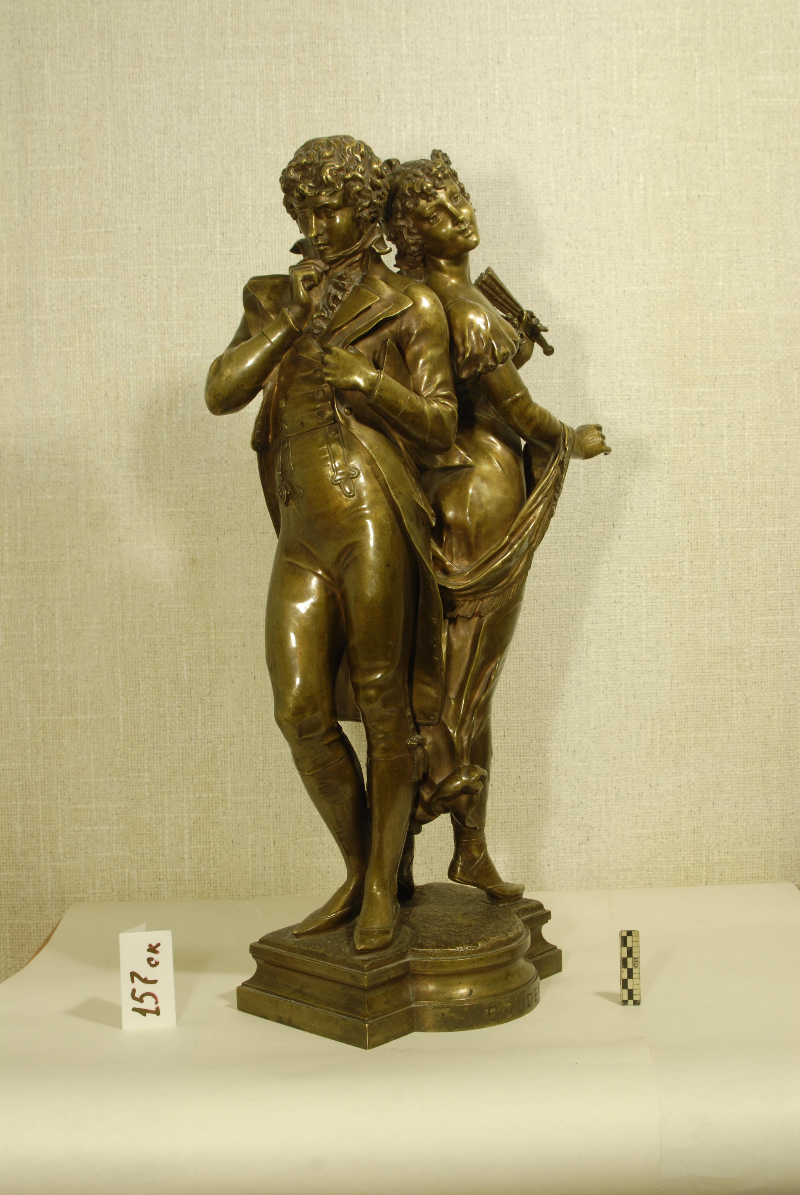Кількість: 1/Опис: На невисокому постаменті - кавалер та дама, які стоять спиною один до одного. В лівій руці у дами складене віяло, у кавалера під лівою рукою - трикутний капелюх. На постаменті ззаду праворуч напис "Forville Suan", на боковій поверхні постаменту назва "La Boudevie"