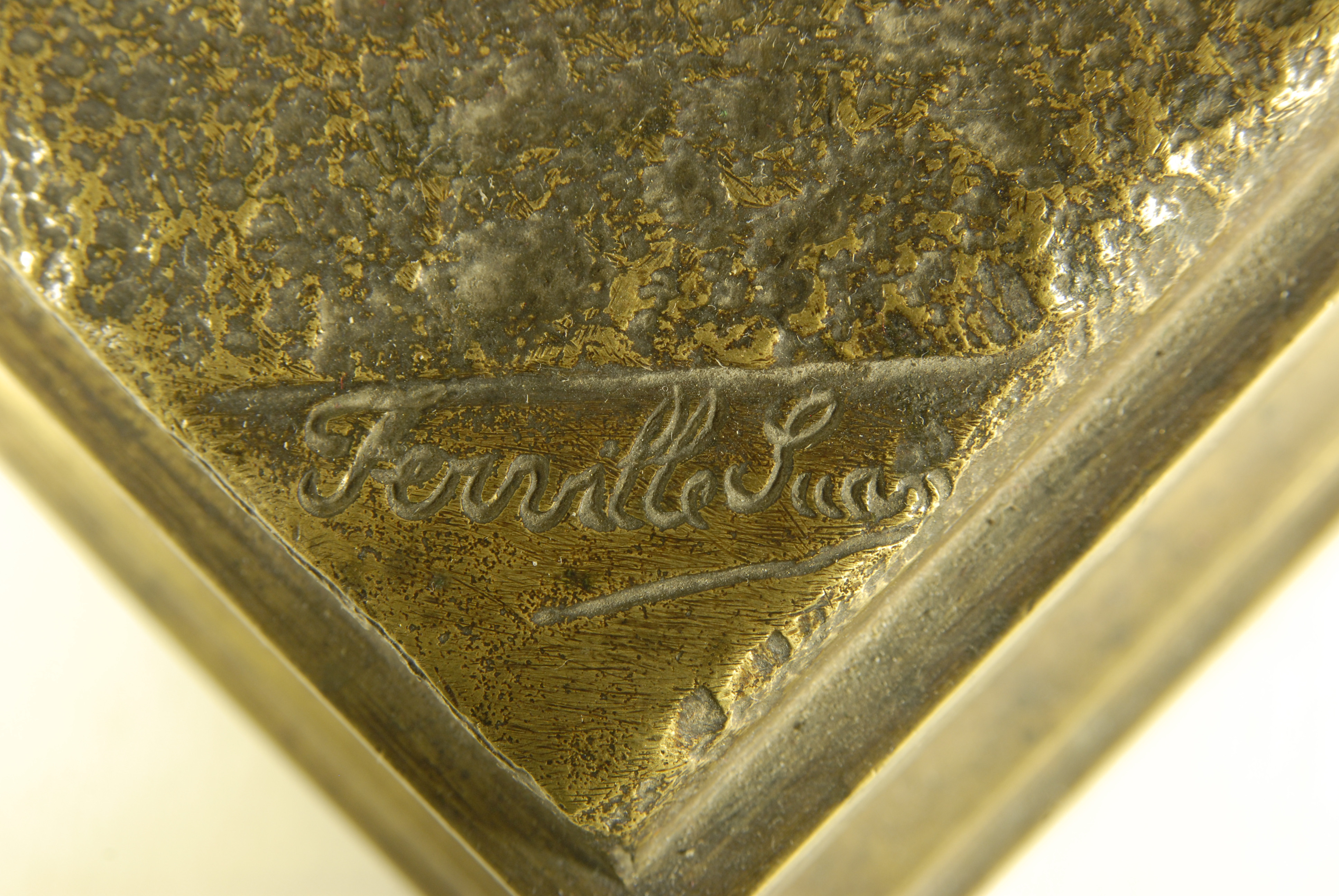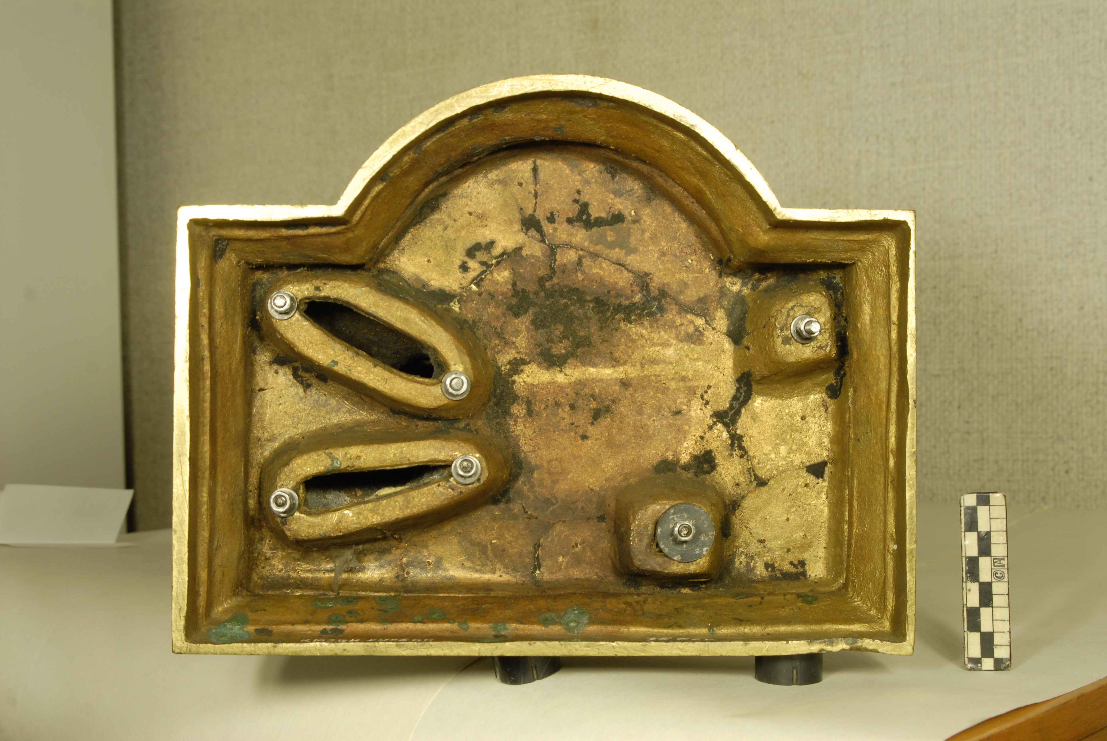 Забруднення. Повсюдно потертості, подряпини, плями. На шалі дефекти лиття (до 1мм). На постаменті, під ногами фігур, вставки, біля країв залишки олов'яного припою.,