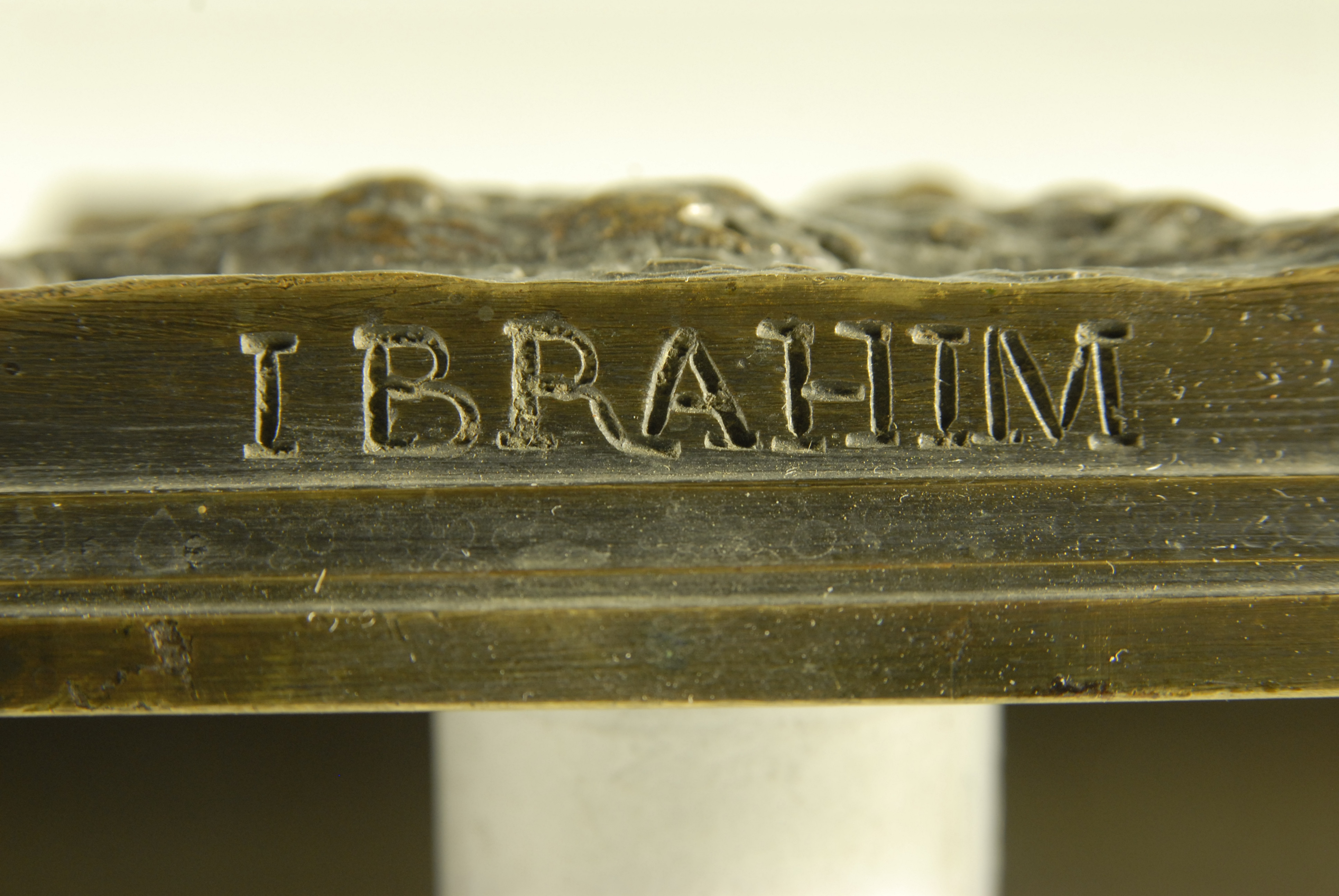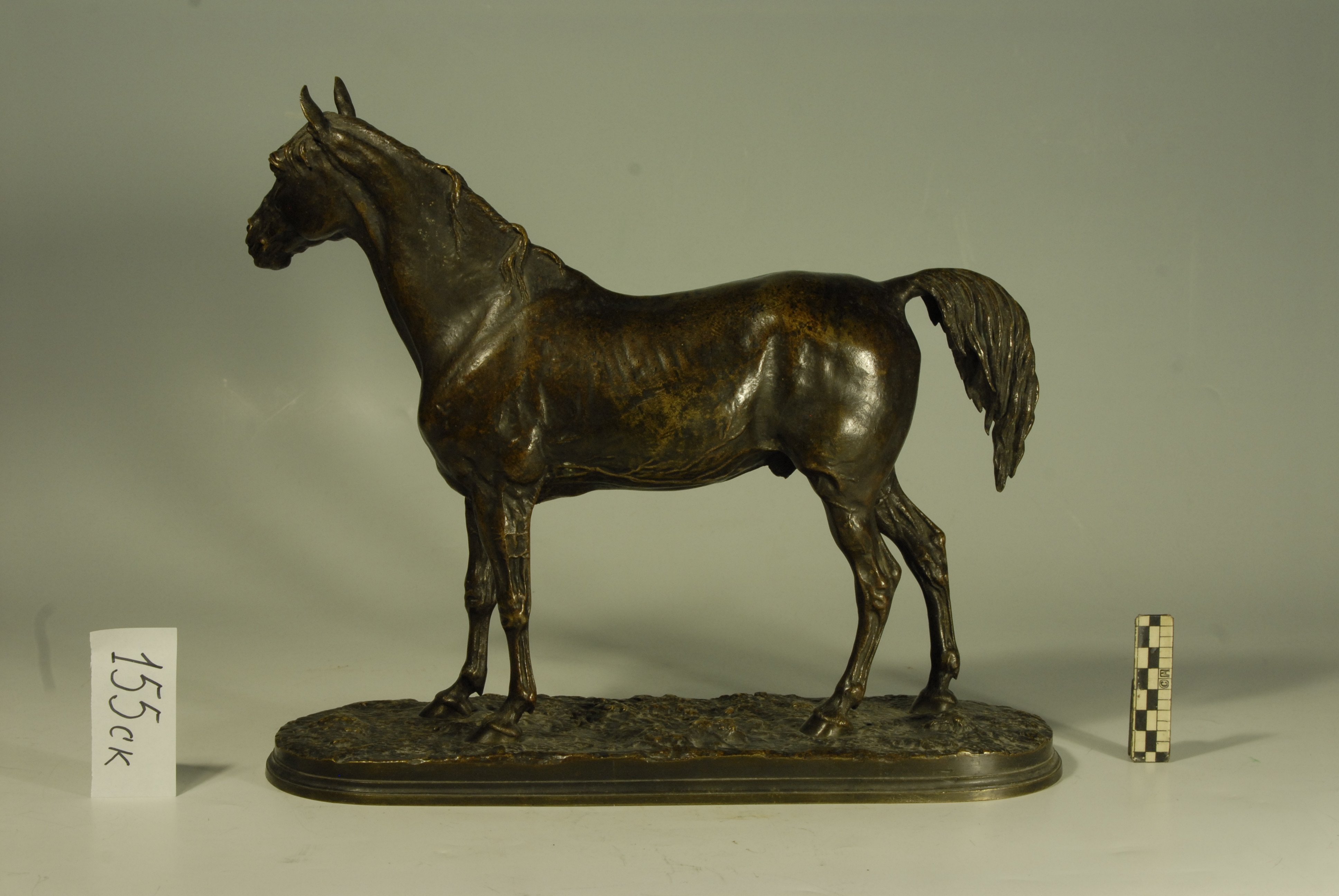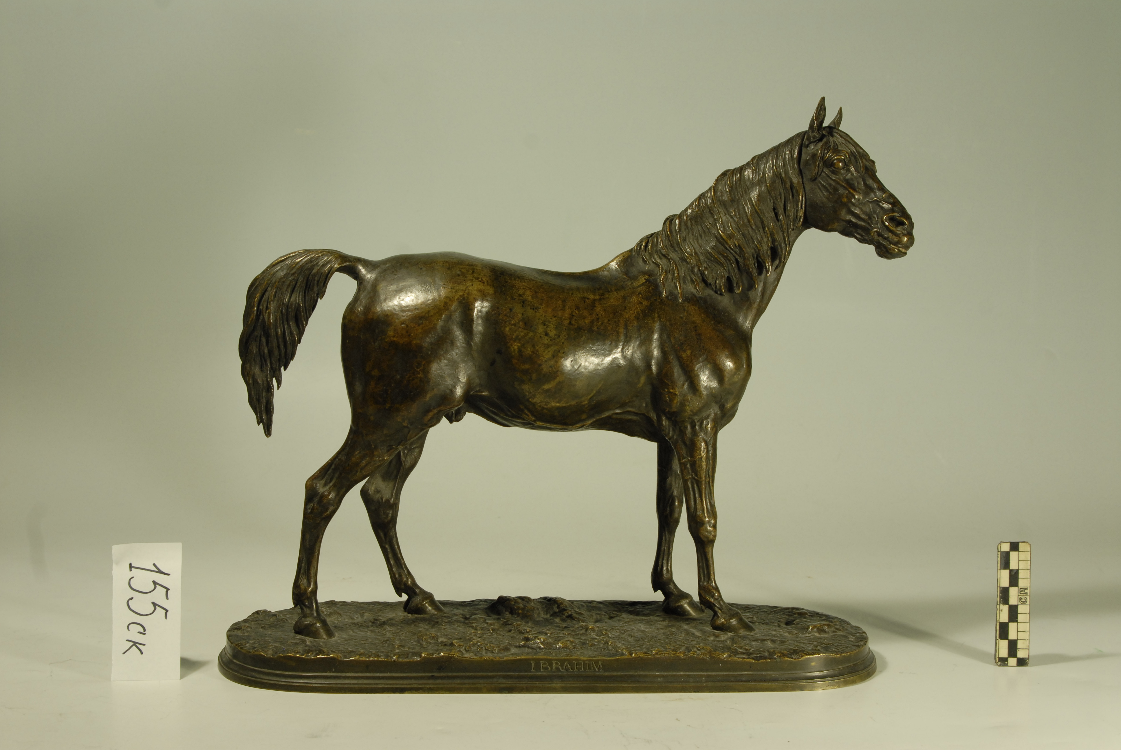 Кількість: 1/Опис: Зображення коня, який стоїть, з головою повернутою вправо; грива перекинута на праву сторону, хвіст підведений. Постамент прямокутної форми з закругленими кутами і нерівною поверхнею. По краю верхньої площини постаменту в центрі - напис "P.J.Mene", під нею на вертикальній частині напис "IBRAHIM".