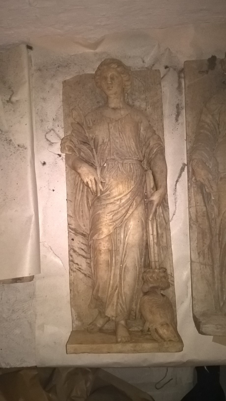 /Опис: Фігура жінки зображена на повен зріст. На ній хітон і плащ, що спадає складними вигадливими складками. В її руках фрагменти атрибутів, нерозпізнаних внаслідок ушкоджень.
