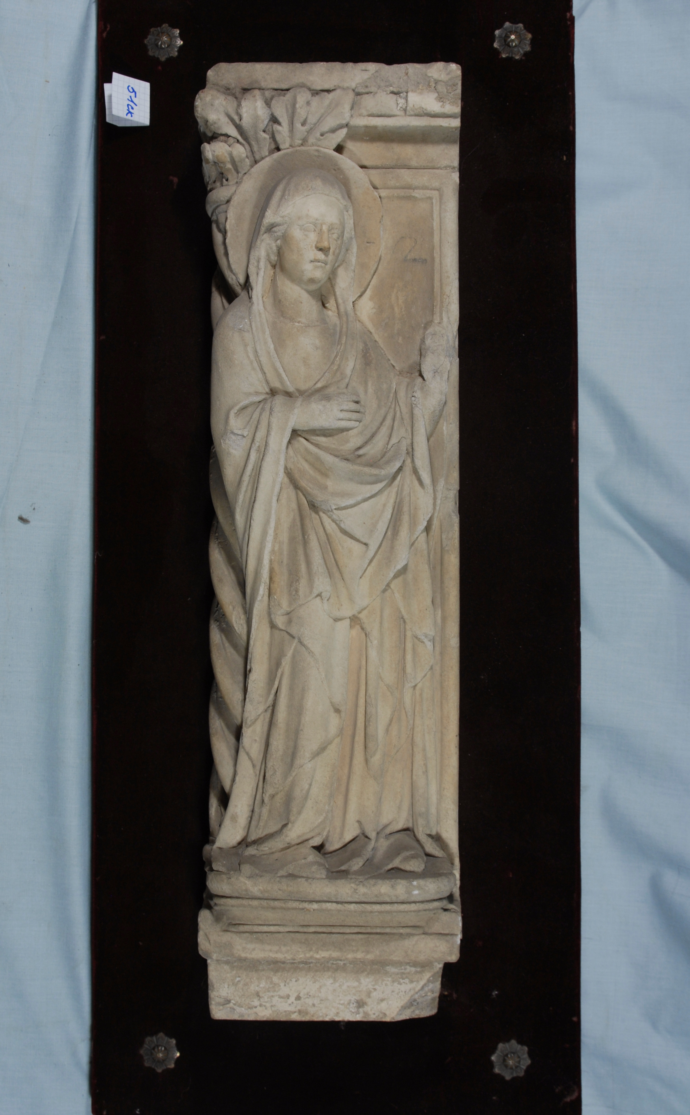 Аналогіi: парна до № 47/Кількість: 1/Історія предмета, легенда: Придбана в Римі./Опис: Мадонна зображена на повний зріст; фігура в ¾ повернута вправо. На ній гладенький одяг та плащ, що спускається пишними складками, накинутий на голову та перекинутий через ліву руку. Права рука лежить на грудях. Навколо голови німб. Зліва вита колона з аканфовою капітеллю.