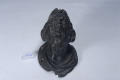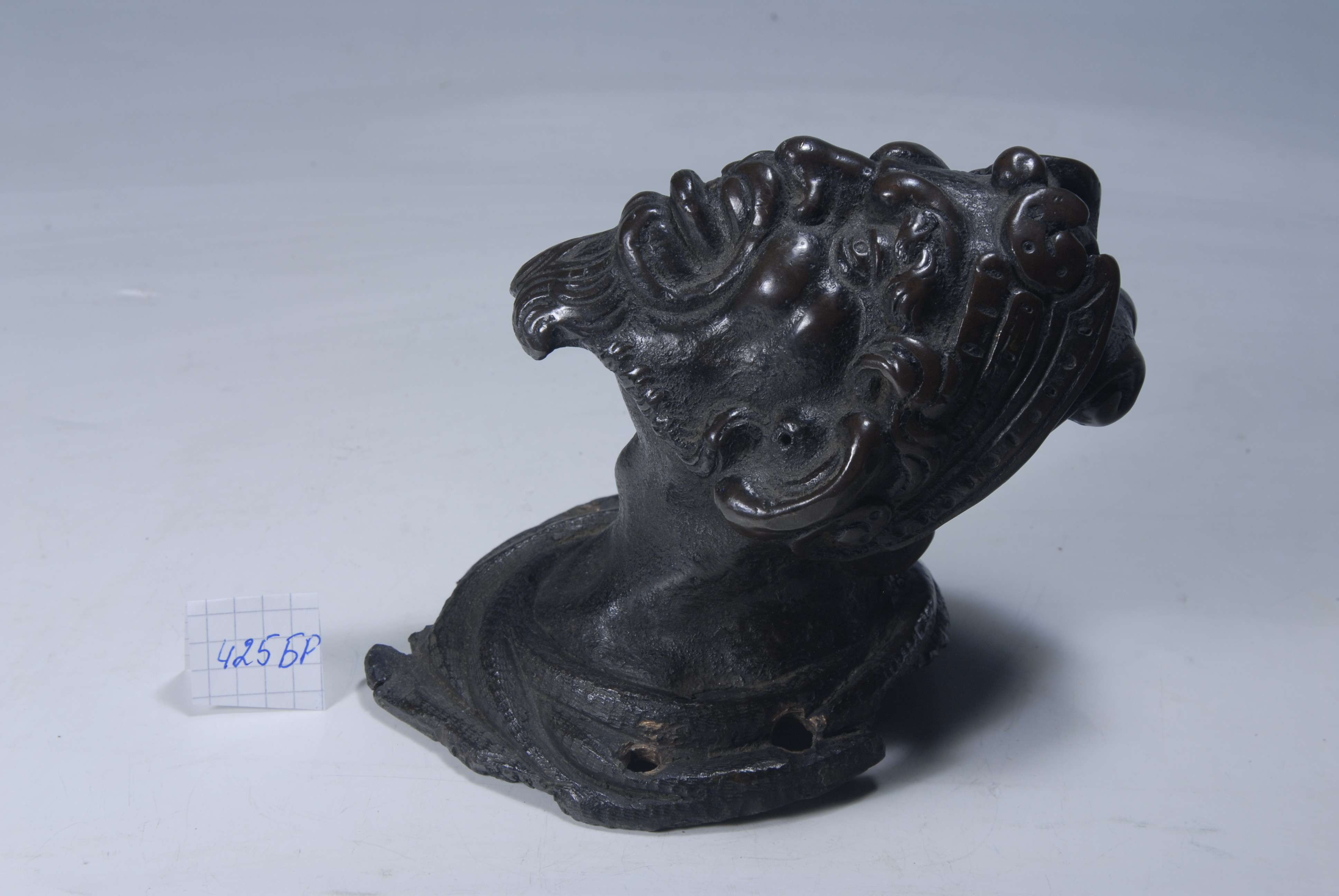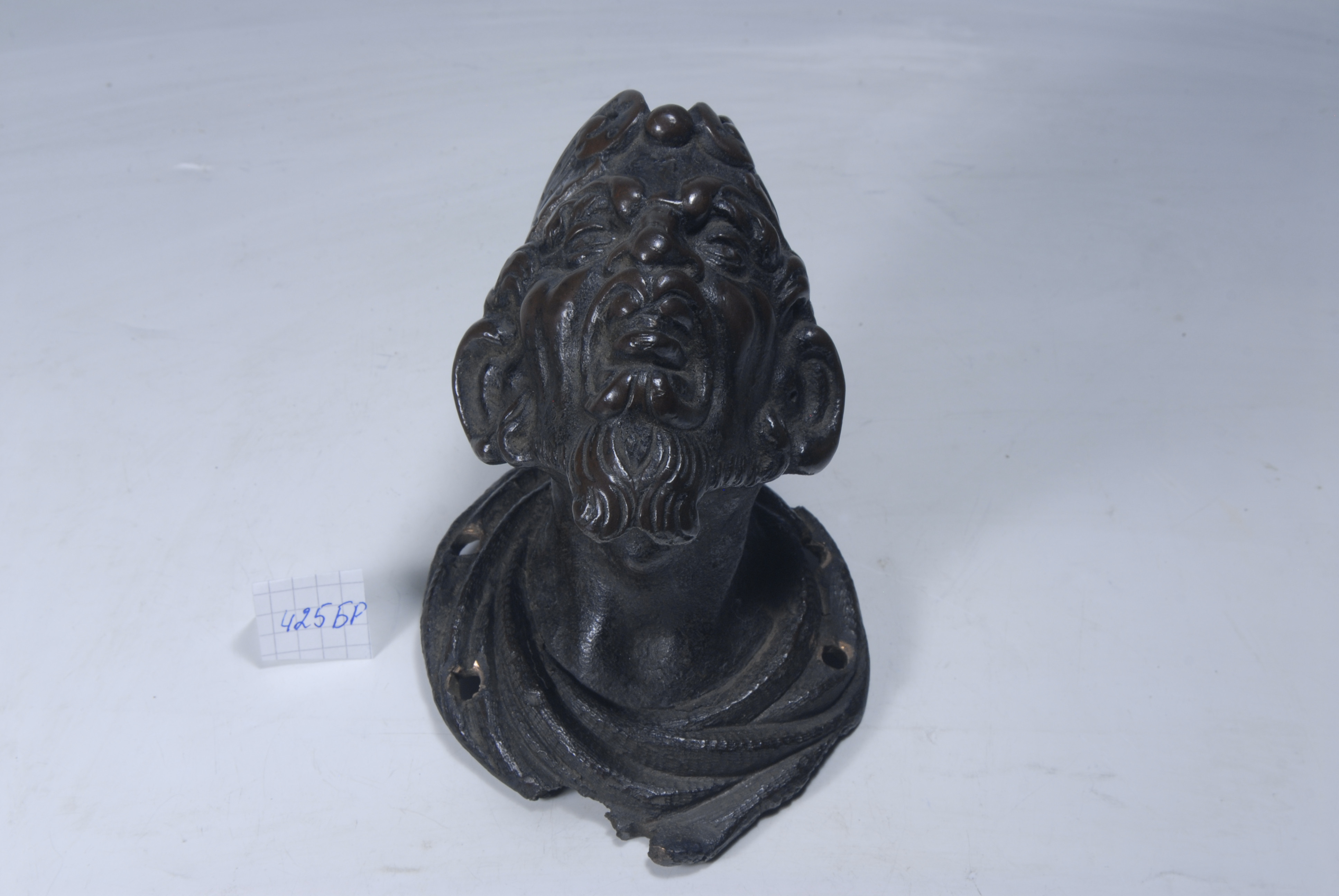 /Кількість: 1/Опис: Зображення сатира трактовано у гротесковому стилі. Голова у головному уборі відкинута назад. Лице має вуса - орнаментальні завитки та невелику борідку, що завивається під підборіддя. Рот відкритий, язик висунутий. Головний убір складної форми, декорований зверху рельєфними орнаментальними завитками, що спускаються на затилля. У основі шиї - драпірування (має чотири отвори, за допомогою котрих твір було закріплено на підставці з дерева, що відсутня).