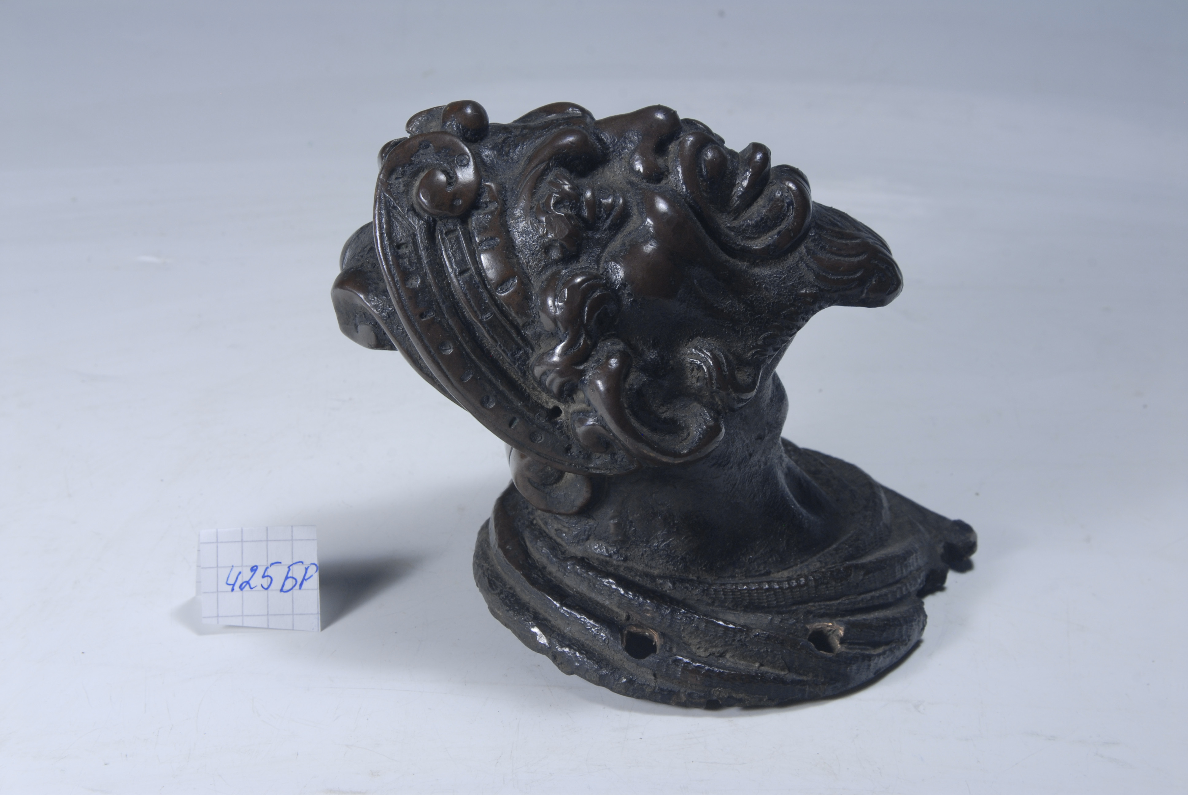 Загальне забруднення. Втрати металу: на головному уборі зверху у центрі – 0,7х0,4 см та 2х1 см.; частина правого завитка головного убору – 1х0,5 см.; на драпіруванні у верхній частині праворуч – 3,5х0,5 см та у нижній частині – 3х0,5 см. У лівому вусі та за правим вухом – невеликі отвори (ливарні (?)). Драпірування має 4 не автентичних круглих отвори D – 0,5 см, для кріплення – два ліворуч та два праворуч. На звороті відсутня частина кріплення.,