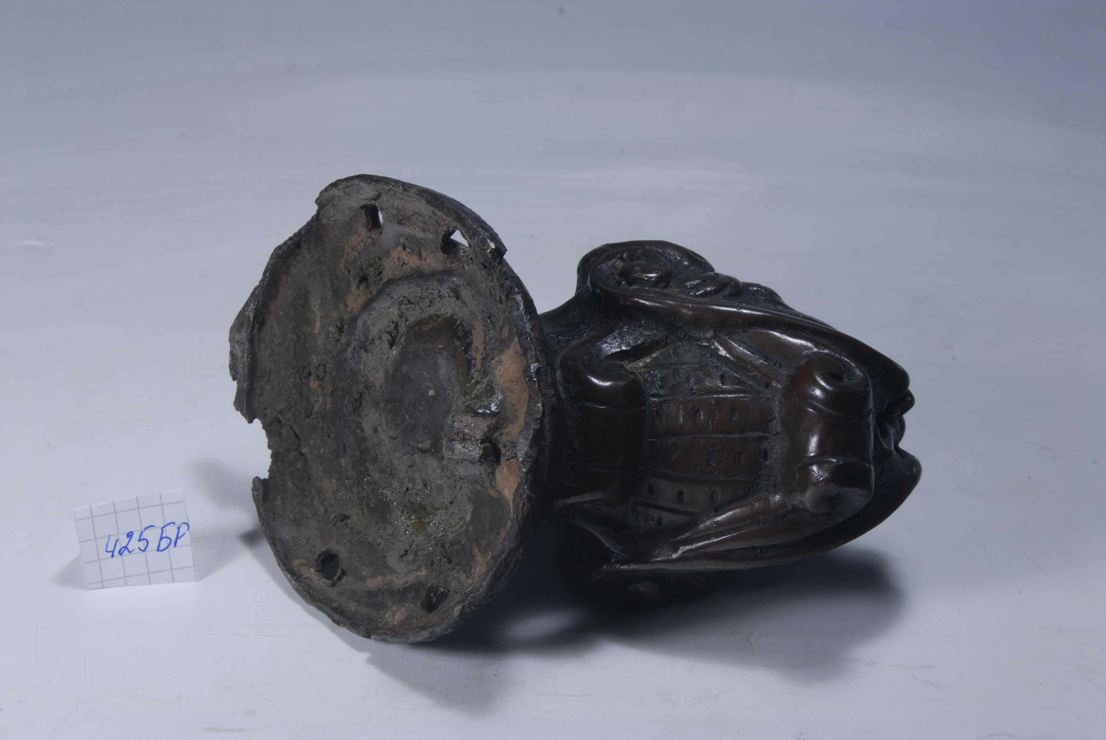 Зворот - зверху є частина кріплення, вхідний отвір у середину запаяний, усередині – метал-наповнювач (олово?).