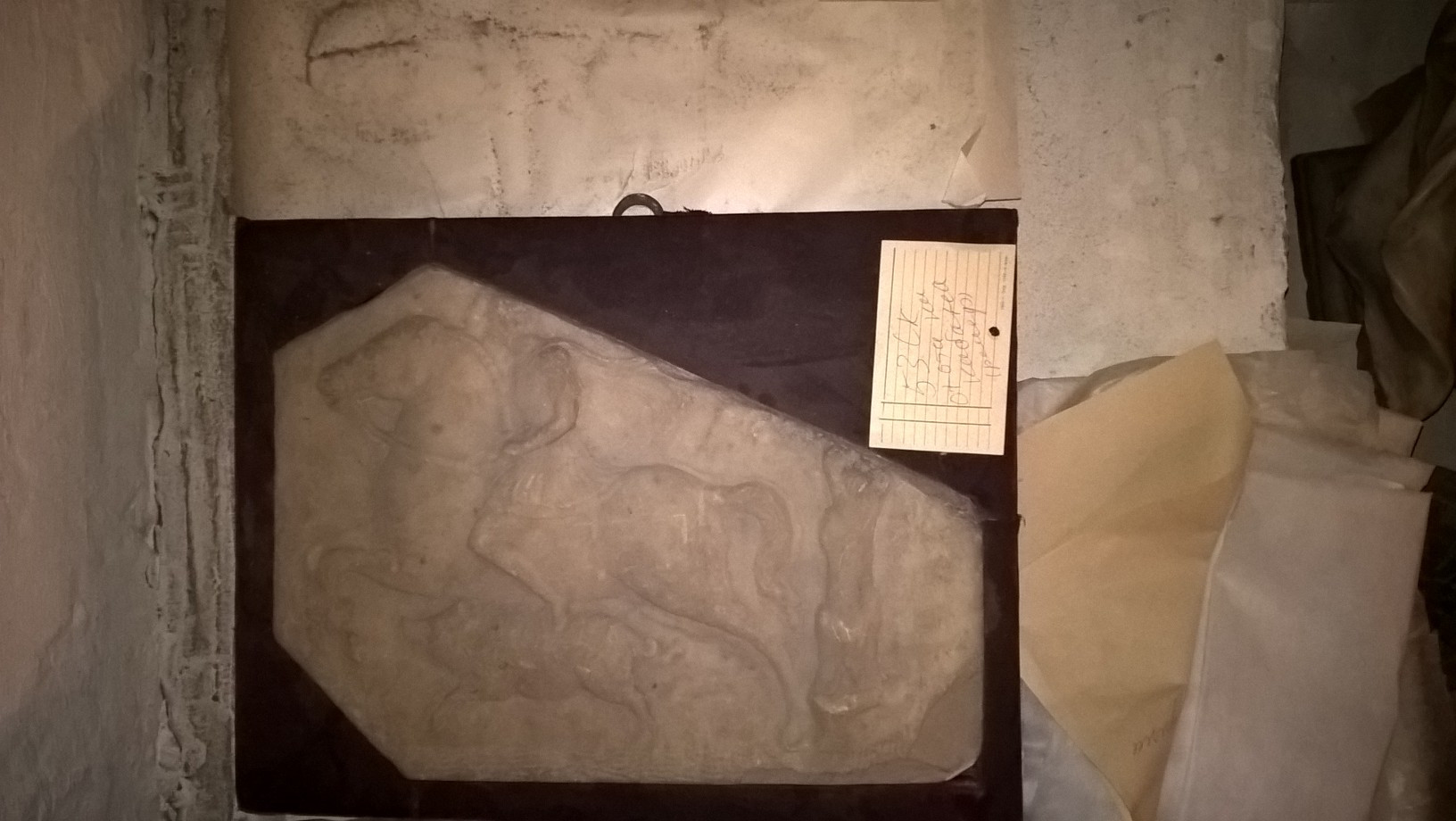 Кількість: 1/Історія предмета, легенда: Куплений із зібрання Ферроні в 1909році./Опис: Зображення вершника на коні, який скаче щодуху. Фігура повернена вліво. Його обличчя з довгою бородою повернене в фас. На ньому військовий одяг, стилізований під античність. На голові шолом, з-під якого спускаються пасма розпущеного густого волосся. На плечі накинуто плащ, що розвивається. Поруч з вершником мчить дикий кабан. Направо стовбур дерева.