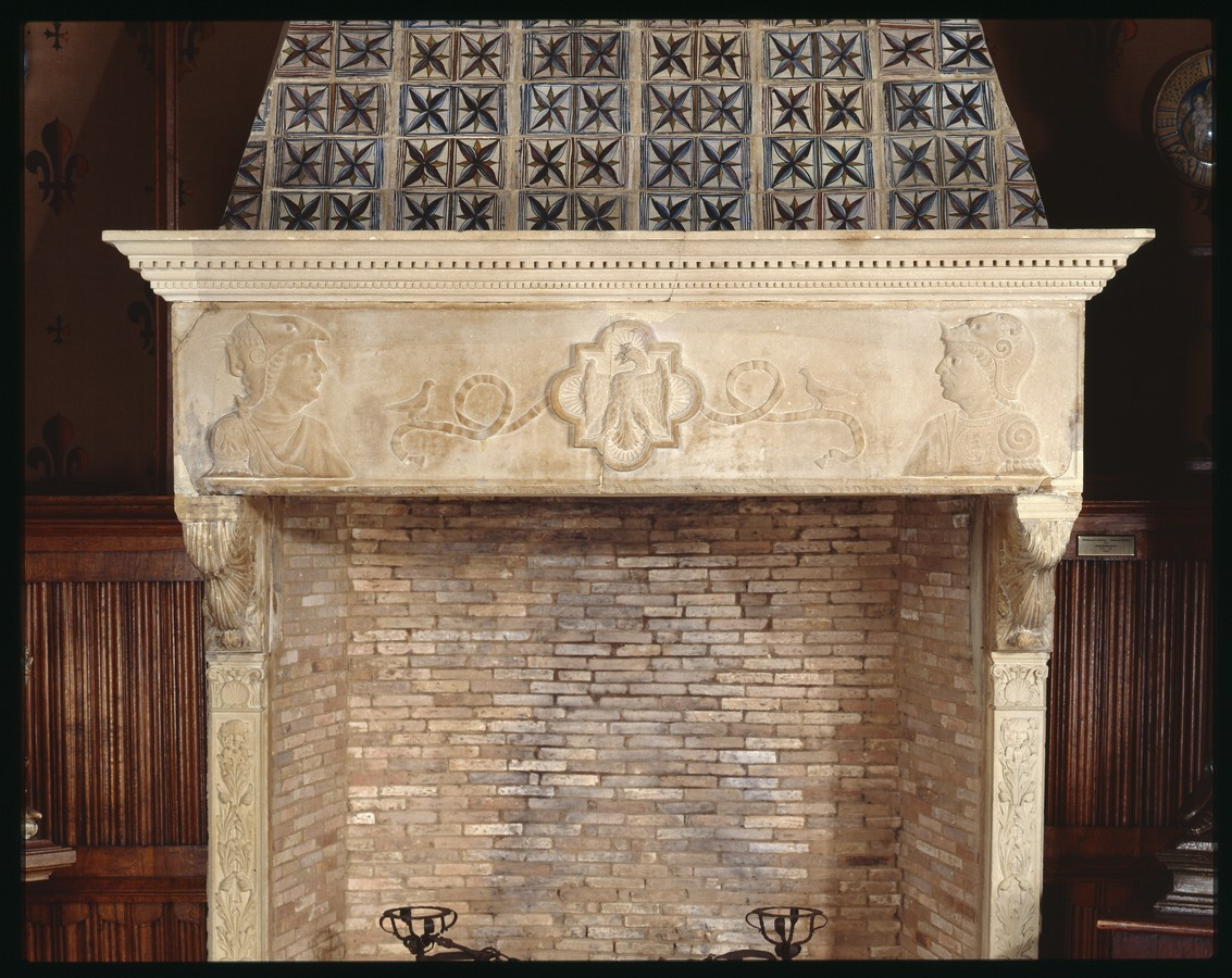 Кількість: 1/Старі документи прийому: Перенесений з БР №260, акт Від 10.10.1953р/Опис: Камін обрамлений широким антаблементом, увінчаним сильно виступаючим профільованим карнизом. Антаблемент тримається на двох кронштейнах, прикрашених рельєфним акантовим листям, які спираються на два пілястра. Нижня частина каміна в своїй центральній частині прикрашена рельєфним одноглавим орлом в короні. По обидві сторони від орла відходять звивисті стрічки, на яких сидить по одному птаху. З лівого боку - рельєфне зображення воїна в шоломі. З правого - зображення юного воїна в шоломі. Верхня частина каміна складена з кахлю. Кахлі розписані восьмипелюстковими розетками.