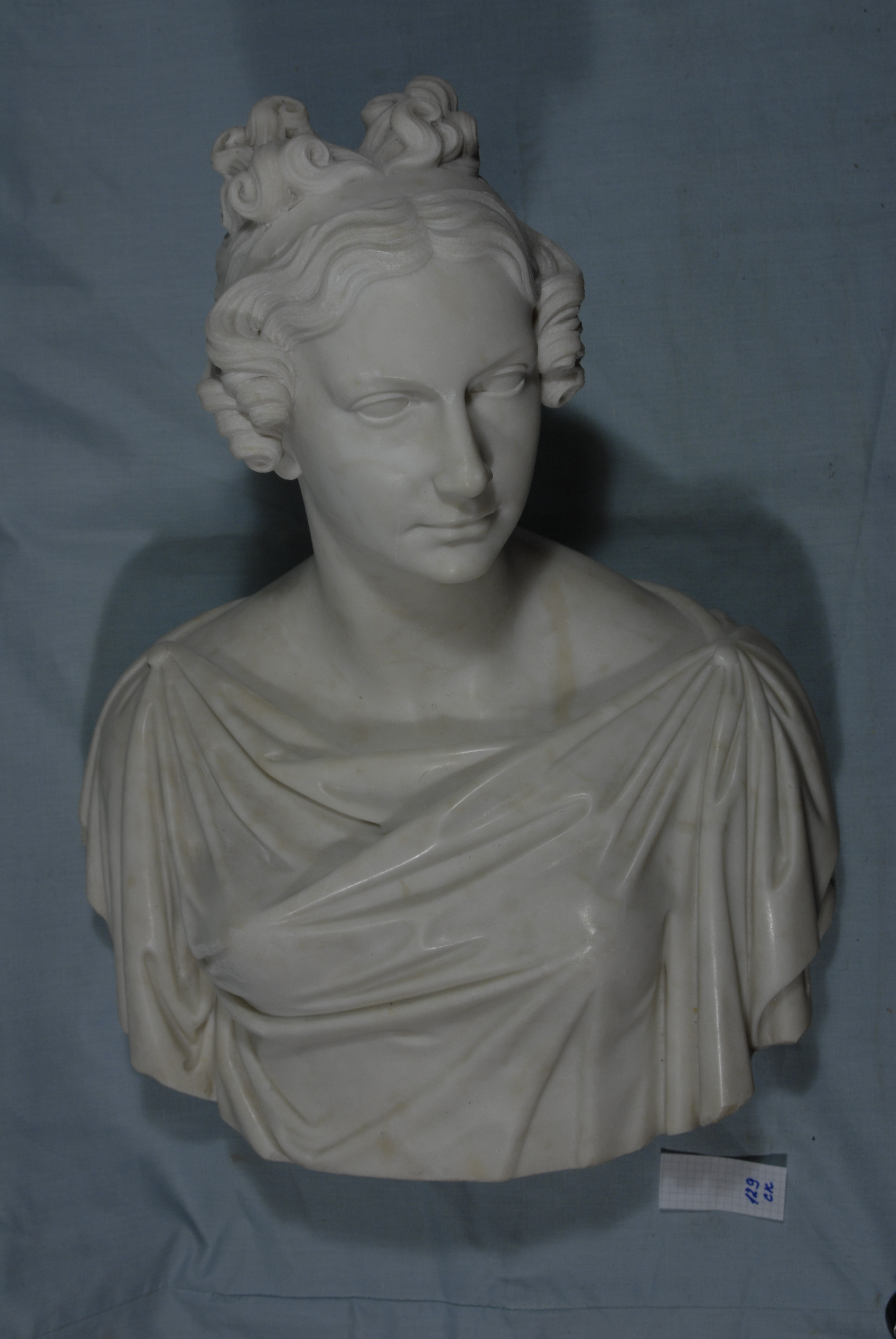 Кількість: 1/Опис: Бюст молодої жінки в античному одязі. Торс зображений фронтально. Голова злегка повернена вліво. Видовжене обличчя з класично правильними рисами обрамлене локонами, що лягають симетрично по два з кожного боку. Високо підібране ззаду волосся вкладене локонами на маківці. Одяг, що лягає складками, закріплений на плечах.