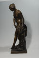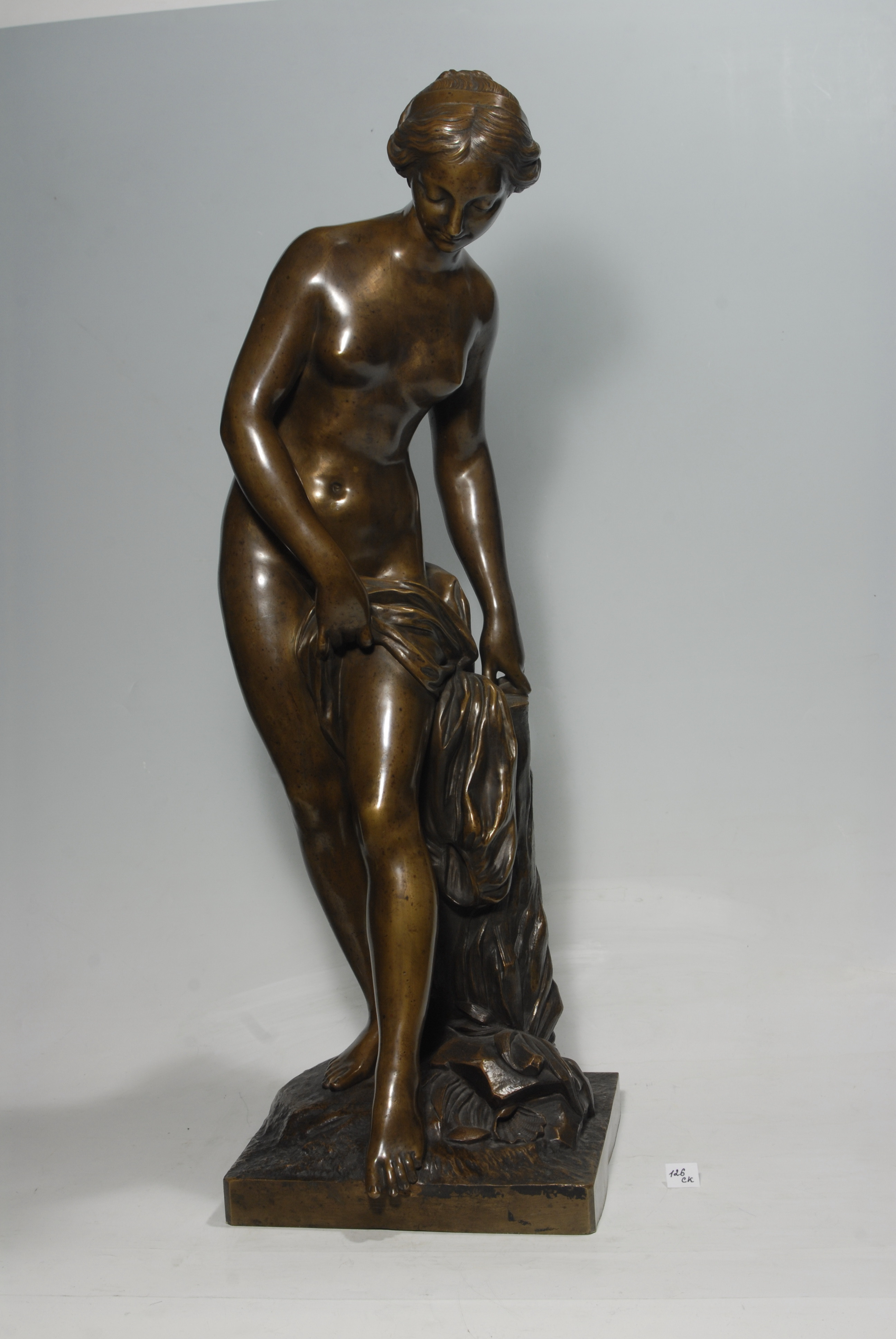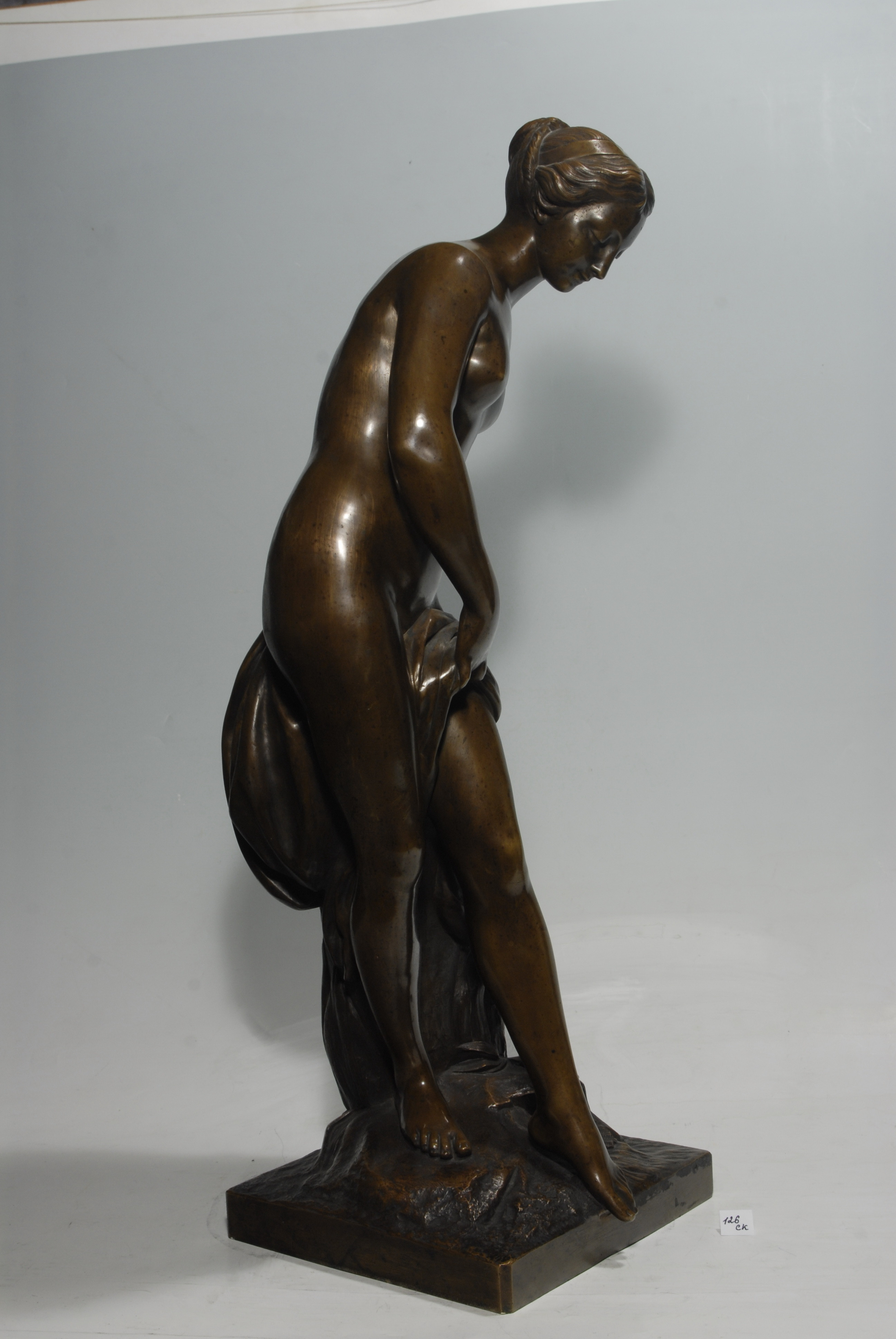 Кількість: 1/Опис: Молода оголена жінка стоїть спираючись на праву ногу і виставивши ліву вперед, наче збираючись торкнутися води. Торс купальниці злегка нахилений вліво. Однією рукою вона підтримує тканину, що обвиває її стегна, другою – спирається на пінь дерева. Волосся на маленькій голові перев'язане стрічкою, заплетене в коси і закріплене на потилиці. Обличчя нахилене і повернене вправо. Постамент невисокий, квадратний.