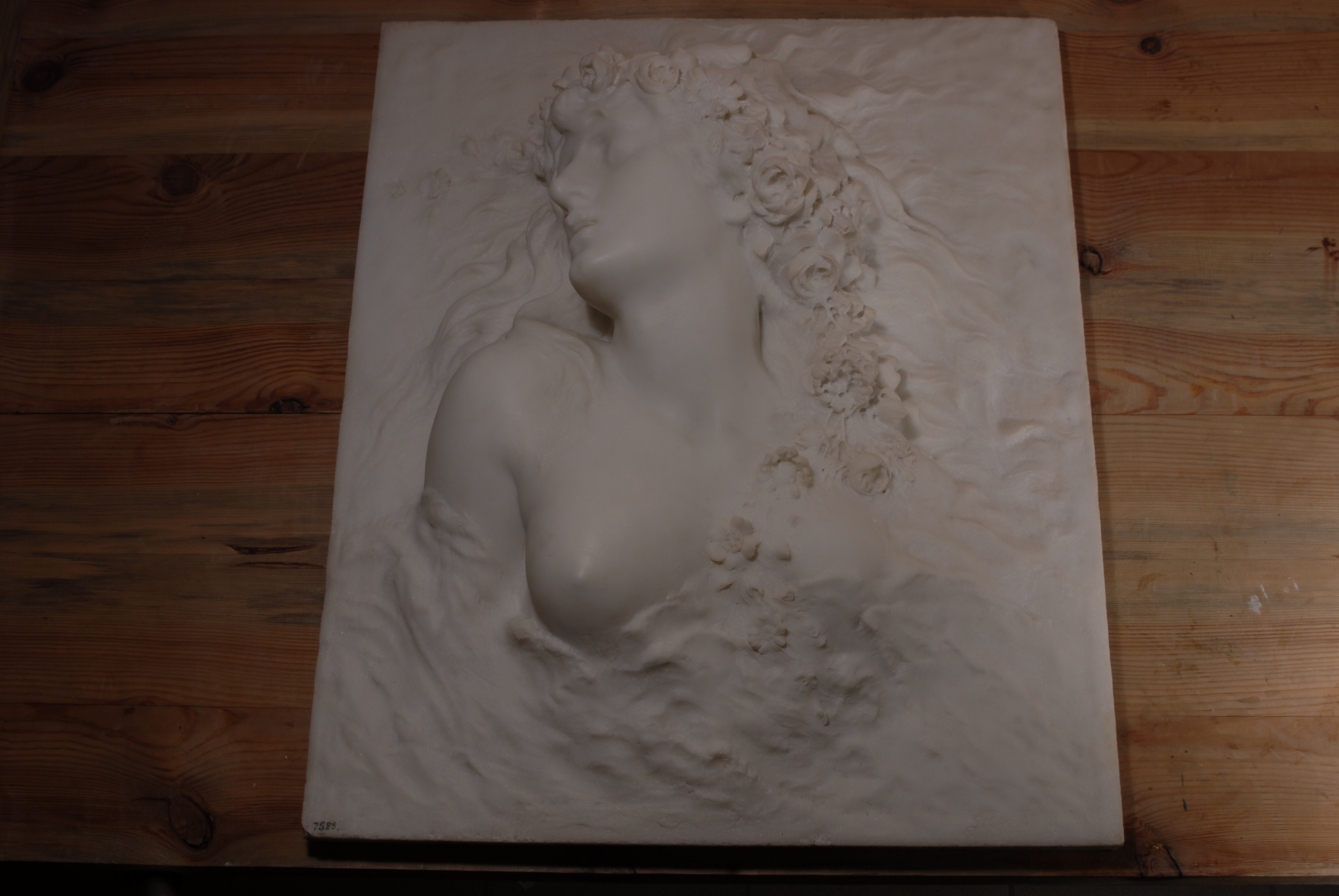 Авторські підписи, клейма: Sarah Bernhardt/Кількість: 1/Опис: Поясне зображення мертвої Офелії, що пливе на спині з поверненою до правого плеча головою. З води виступають злегка закинута голова, голі груди і праве плече. Розсипане по воді волосся Офелії прикрашене вінком з квітів, кінець якого спускається на груди. Справа внизу підпис: Sarah Bernhardt.