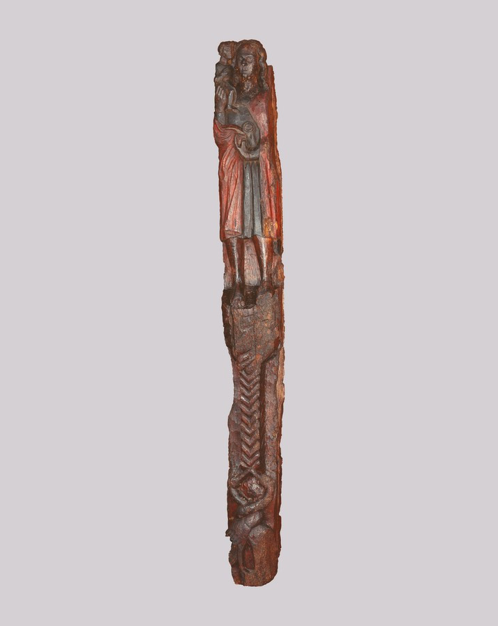 Кількість: 1/Історія предмета, легенда: придбана з колекції Альберіччі в Римі/Опис: Святий Христофор (пілястр). Верхня частина пілястру оформлена у вигляді умовно трактованої фігури Святого Христофора з маленьким Христом на правому плечі. Одною рукою він підтримує немовля, іншою - загортає у пояса короткий плящ, що доходить до колін та закріплений на груді круглою застібкою. Довге волосся Христофора хвилястим пасмами спускаються на плечі. Його босі ноги стоять на косому зрізі, що звужується до низу колони, яка нижче переходить у чотиригранний стовб, прикрашений різбленим геометричним орнаментом. Основу стовбчика підтримують дзьобами два геральдично розташовані птаха з перекрещеними шіями.