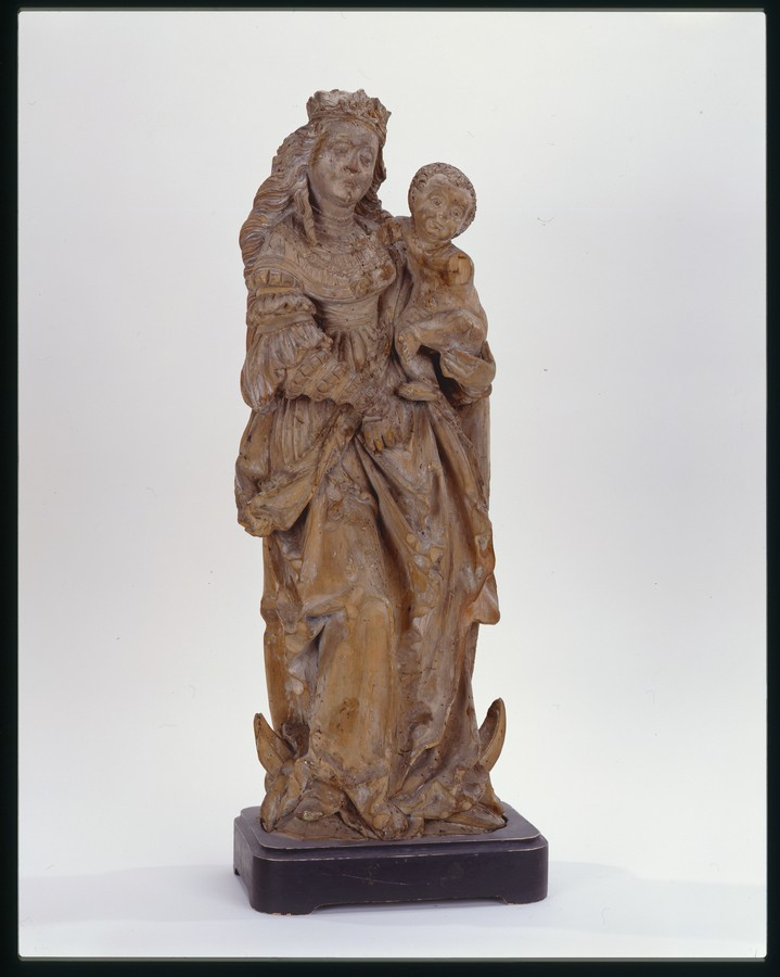 Кількість: 1/Опис: Молода Мадонна з немовлям Христом на лівій руці зображена на місяці. Вона одягнена в сукню знатної дами 16 ст., що перетягнуте на талії, з пишними рукавами. На ліве плече накинутий широкий довгий плащ, що залишає видкритими верхню частину фігури та праву руку. Зі спини він спадає свободно, спереду низпадають широкі готичні складки. На голові Мадонни корона з-під якої широкою хвилею спускається на спину густе волосся.