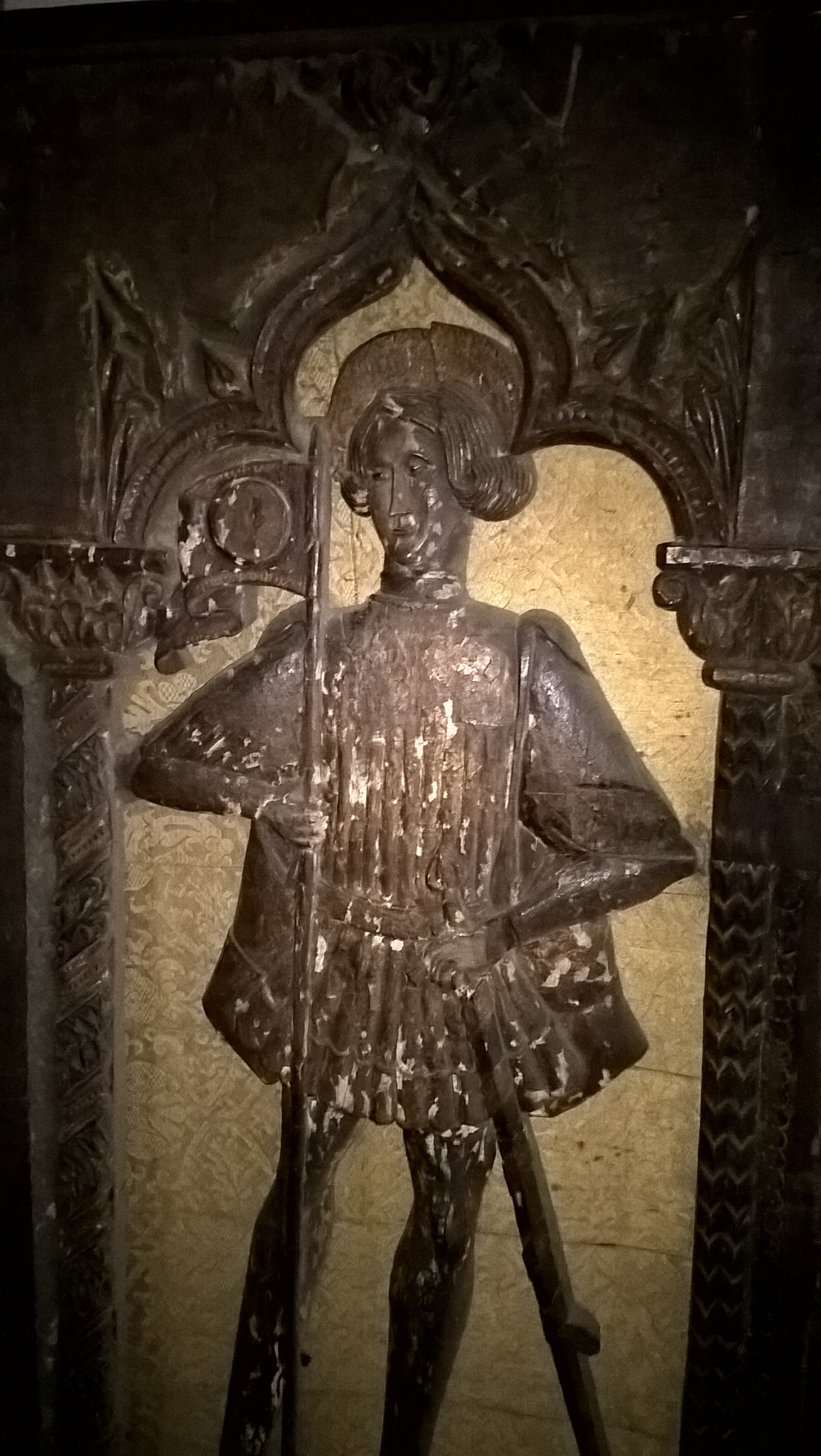 Кількість: 1/Історія предмета, легенда: придб. в Римі із зібрання Альберічі/Опис: Під трилопатевою стрілчастою аркою, що спирається на різьблені колони, стоїть на повен зріст молодий Юліан. У правій руці він тримає корогву, що розвивається; ліву поклав біля пояса на руків’я довгого меча. Одягнений і причесаний Юліан по моді 15 століття. На плечі його накинутий короткий плащ. Над головою широкий німб. На дошці під рельєфом вирізаний наступний текст латиною:
