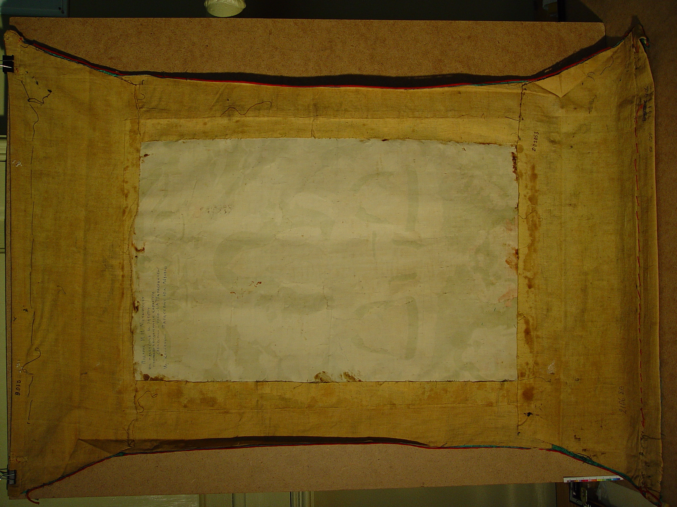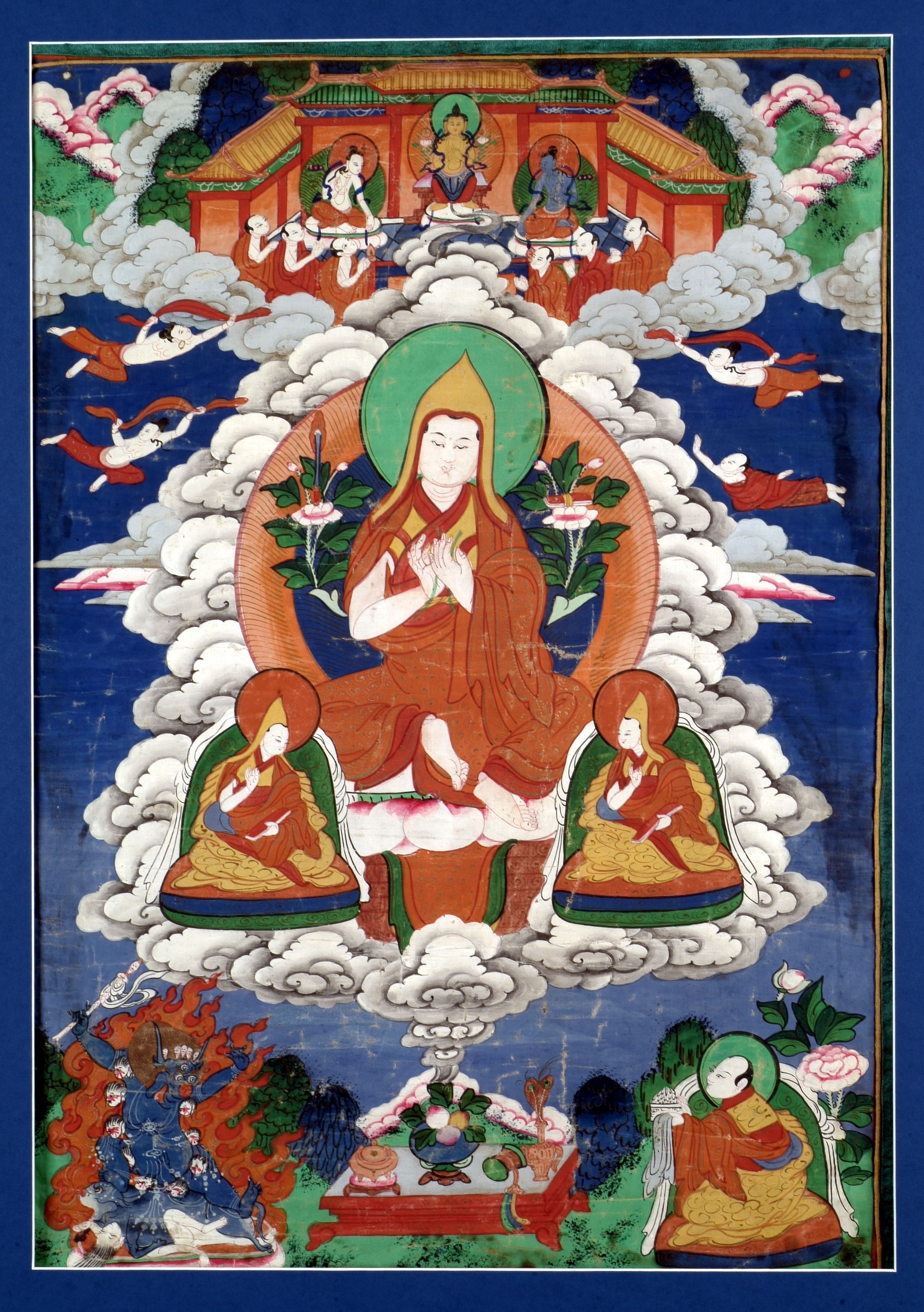 (тиб. tsong-kha-pa blo-bzang-grags-pa)/Опис обрамления, постамента: Райдуга червоного та жовтого кольорів, обрамлення зеленого атласу, жолкхеб в наявності./ншi написи, штампи, печатки, етикетки, наклейки: Напис на зворотньому боці, вгорі зліва синім (чорнилами) в сучасній російській орфографії, рядковий (5 рядків): “Подарок И.И.Мечникову/ от населения за работу/ противоэпидимического характера / Совместно с порф.Л.А.Тарасевичем/ Из колекции Тарасевич Юл.Львовны”
