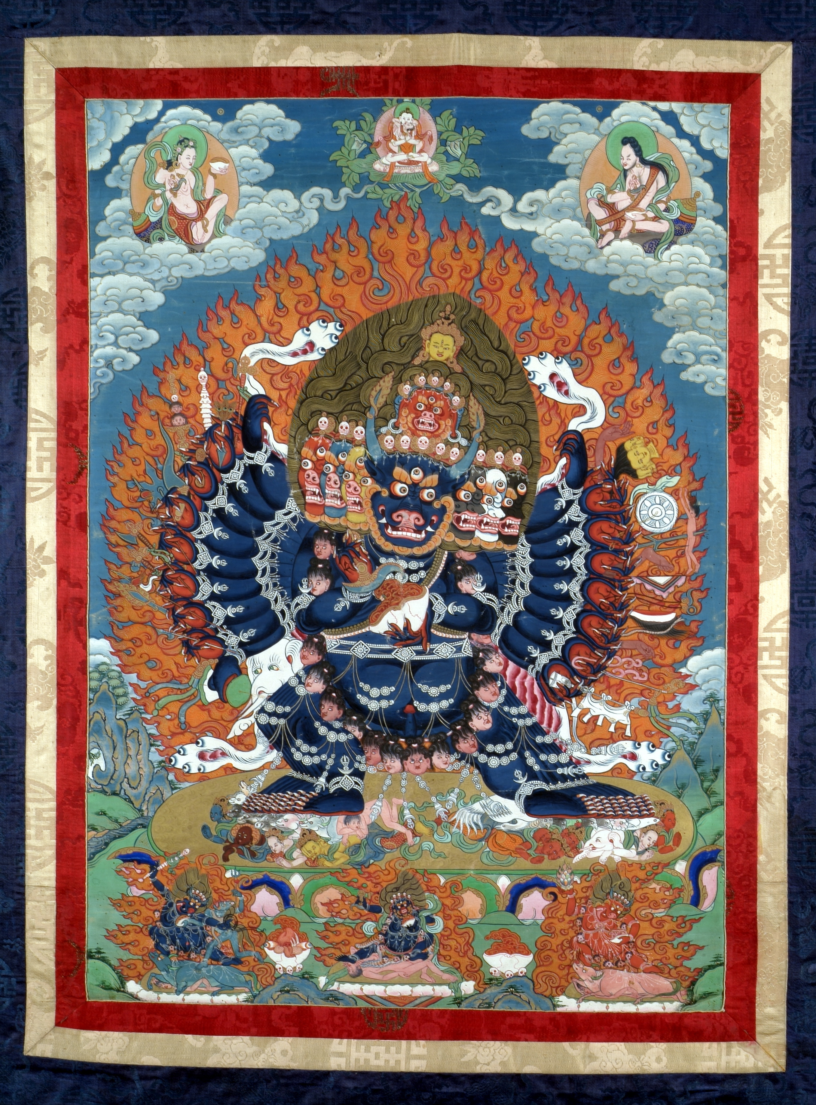 Комм.: Початок XX ст. (не пізніше 1905 р.)/Історія Атрибуціi: Дудко М.М., художник Міністерства культури Бурятії, 2005 р.: Лавранська школа/Кількість: 1/Старі документи прийому: Акт закупівлі № 80/4 ПП від 12.08.1969/Опис: Ваджрабгайрава (скр. vajrabhairava; тиб. rdo-rje-’jigs-byed)/Опис обрамления, постамента: Райдуга червоного та жовтого китайського атласу; обрамлення синього китайського атласу, жалхеб в наявності/ншi написи, штампи, печатки, етикетки, наклейки: Напис на зворотньому боці, у лівому верхньому куті (чорнилами) російською мовою рядком (4 рядки) із збереженням старої орфографії: “Малый Тибетъ. Монастырь Лама Юру./ Изобр[ажение] Бурхана Лашингъ Дарватъ Гуру./ Работа знамен[итого] тибетск[ого] мастера Санкара./ Собр[ание] П.К.Козлова. С.ПБ. 1905 г.”