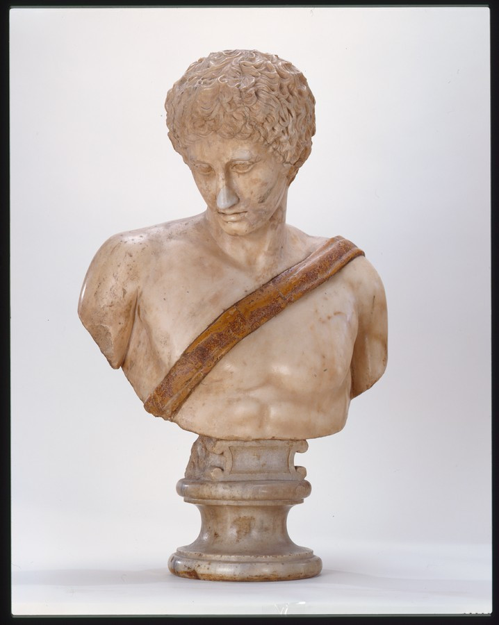 Бюст реставровано з трьох частин. Тріщина йде від кутів рота через щоки зліва вниз по шиї, справа - ближче до вуха. Зкріплена швом відбита ліва частина голови. На правій брові та повіці правого ока вищербини. Кінчик носа та ліва брова реставровані. Тріщину на грудях маскує перев'язь, вставлена реставратором.,